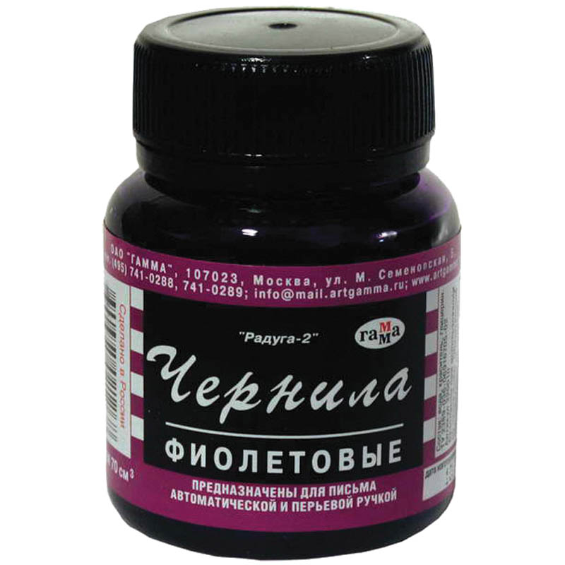 Чернила ГАММА «Радуга» для дозаправки перьевых и автоматических ручек на водной основе имеют оптимальную консистенцию, дают четкие линии, не растекаются во время письма, не проступают на обратную сторону бумаги. В составе только краситель, вода и глицерин. Время высыхания – 30 секунд. Товар выпускается в пластиковом флаконе с фиолетовым цветом чернил и объёме 70 мл.