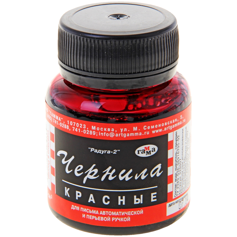 Чернила ГАММА «Радуга» для дозаправки перьевых и автоматических ручек на водной основе имеют оптимальную консистенцию, дают четкие линии, не растекаются во время письма, не проступают на обратную сторону бумаги. В составе только краситель, вода и глицерин. Время высыхания – 30 секунд. Товар выпускается в пластиковом флаконе с красным цветом чернил и объёме 70 мл.