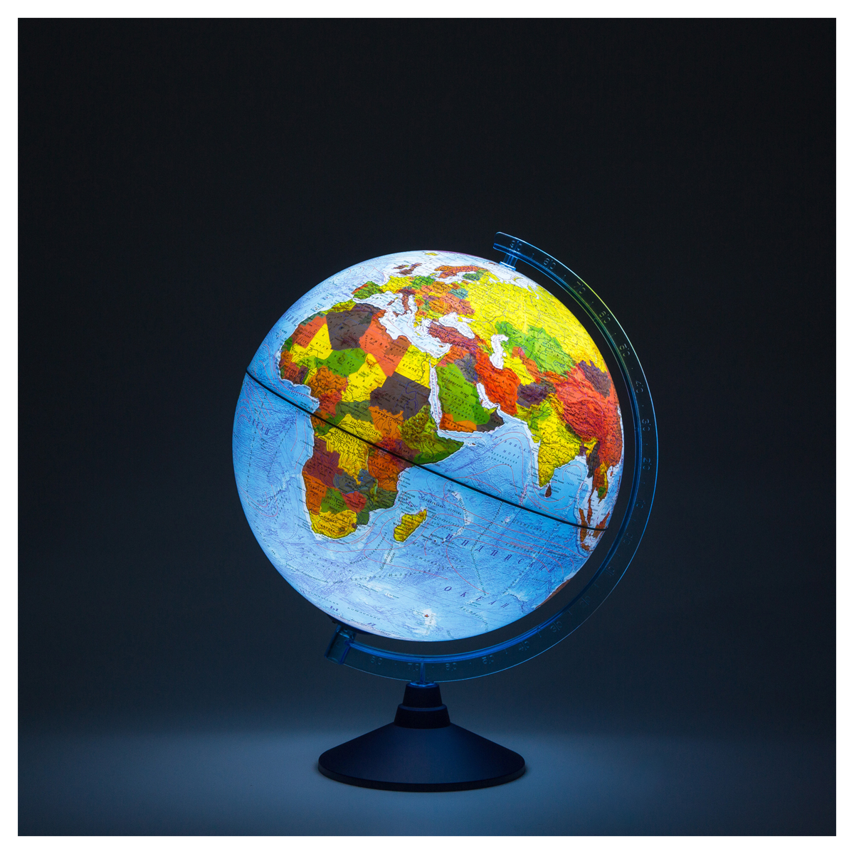Глобус включает в себя две карты: с выключенной подсветкой вы видите физическую карту мира, при включении подсветки – политическую карту мира. Это делает глобус практичным и долговечным в использовании – пригодится школьнику для изучения окружающего мира, географии, истории и экономики.