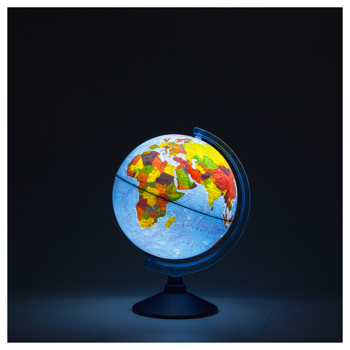 Глобус включает в себя две карты: с выключенной подсветкой вы видите физическую карту мира, при включении подсветки – политическую карту мира. Подсветка глобуса от батареек позволяет безопасно использовать его в качестве ночника. Подсветка работает от двух батареек АА, в комплект при покупке не входят. При необходимости батарейки легко заменить.