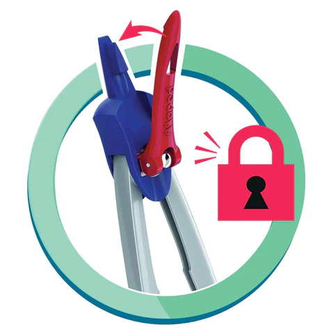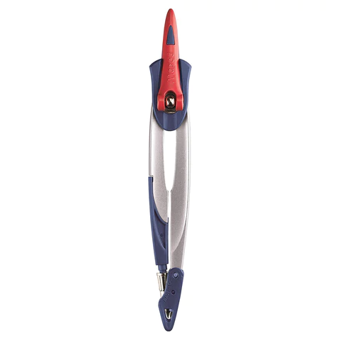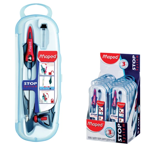 Металлический циркуль из трех предметов поставляется в ударопрочном пенале с подвесом. Произведен с эксклюзивной инновацией, запатентованной Maped - "Стоп-система", которая позволяет фиксировать штанги циркуля в нужном положении. Чертит ровную окружность и прослужит долго. Штанги изготовлены из цинкового сплава. Длина циркуля - 12 см. В футляр встроена линейка (12 см).