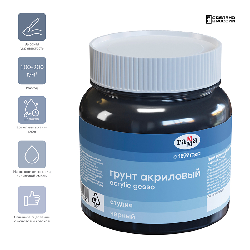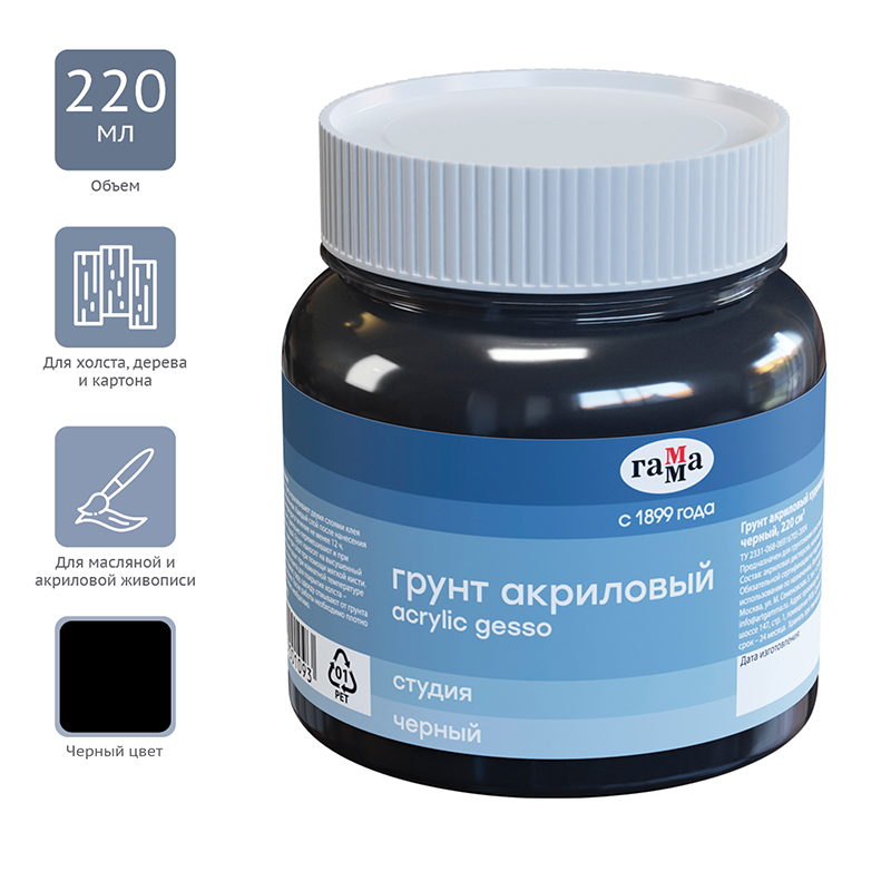 Грунт черного цвета изготовлен на основе дисперсии акриловой смолы и черного пигмента. Подходит для грунтовки холста, дерева, картона и служит прекрасной основной для нанесения масляных, акриловых, гуашевых, темперных красок. Обладает высокой укрывистостью и адгезией, обеспечивая хорошо сцепление красочного слоя с основой, создает шероховатую матовую основу. Черный грунт подходит как для художественных, так и декоративных целей.