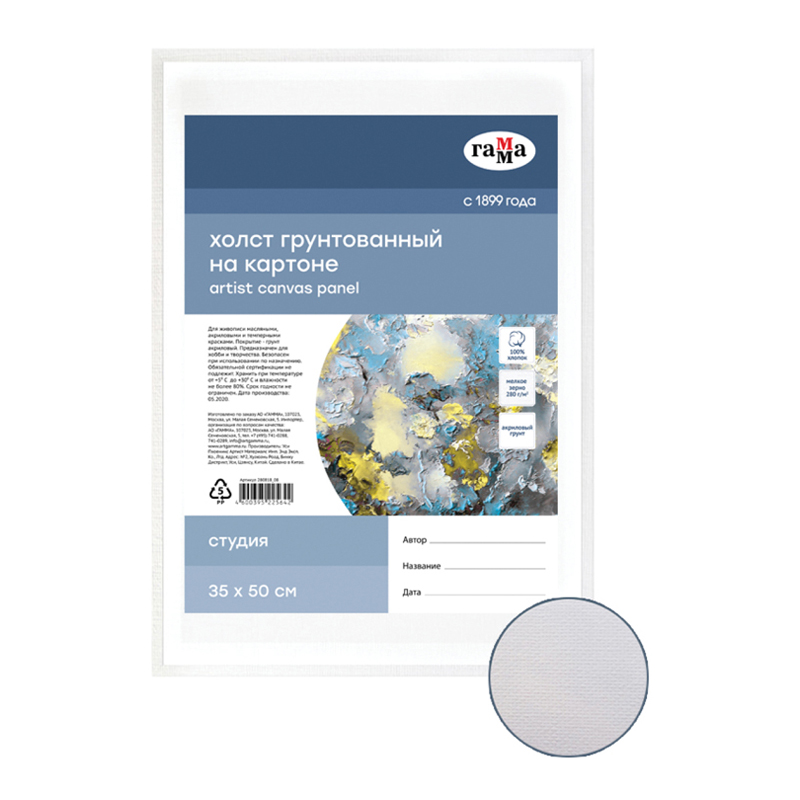 Хлопковый холст ГАММА серии «Студия», грунтованный на картоне, подойдёт для живописи масляными, акриловыми, темперными и гуашевыми красками. Основа – натуральное полотно, 100% хлопок, мелкое зерно. Холст прямоугольной формы плотностью 280 г/м2, размер – 35*50 см. Холст имеет акриловый грунт. Изготовлен без использования кислот.