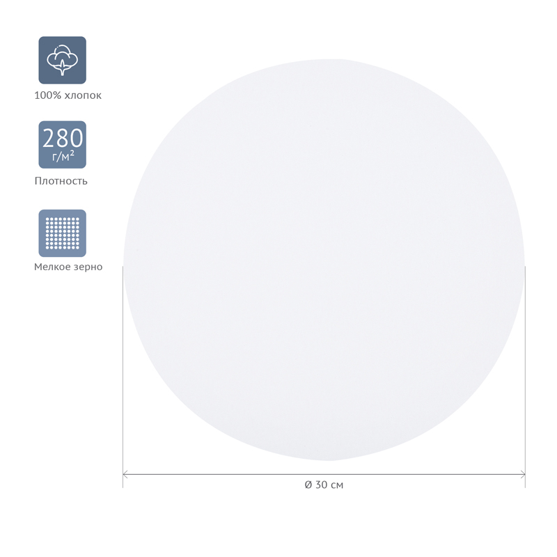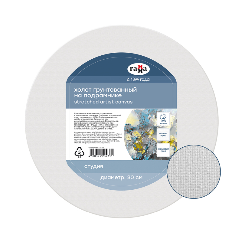 Хлопковый холст на подрамнике ГАММА серии «Студия», круглый и грунтованный, подойдёт для живописи масляными, акриловыми, темперными и гуашевыми красками. Основа – натуральное полотно, 100% хлопок, мелкое зерно. Холст круглой формы плотностью 280 г/м2, диаметр – 30 см. Холст покрыт акриловым грунтом, а подрамник выполнен из МДФ. Изготовлен без использования кислот.