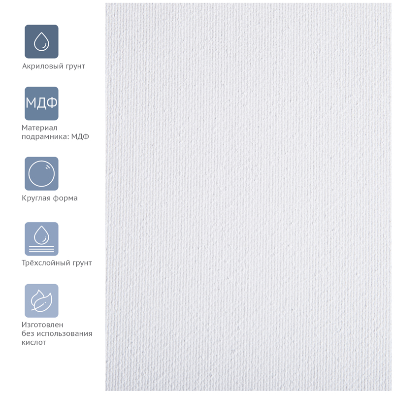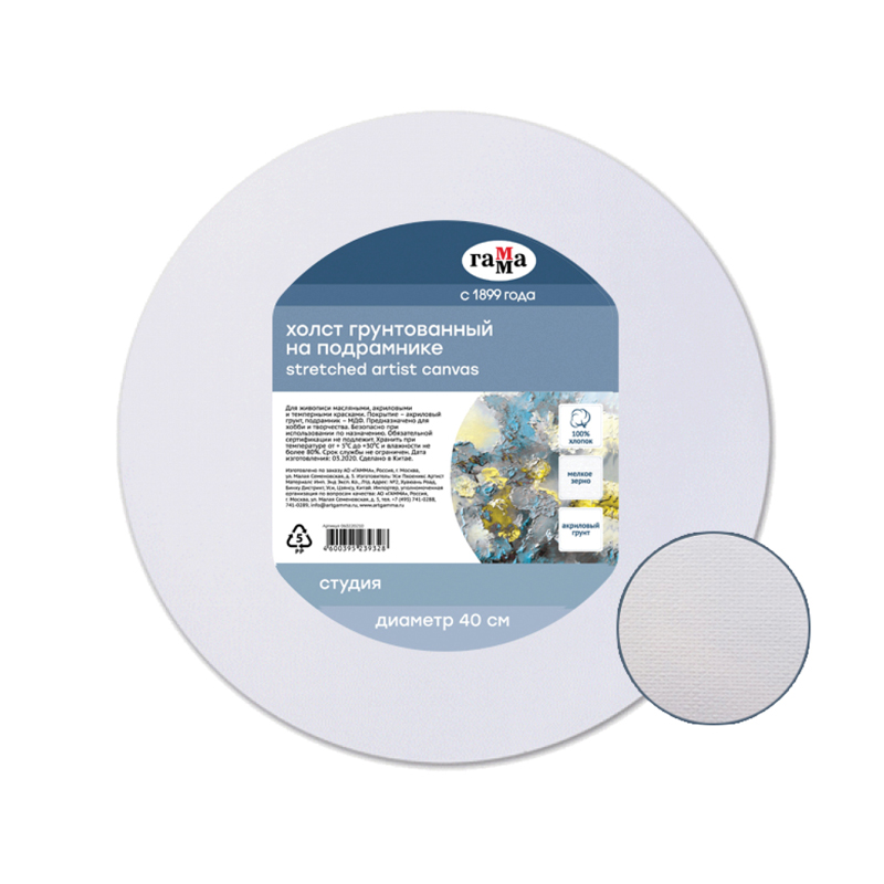 Хлопковый холст на подрамнике ГАММА серии «Студия», круглый и грунтованный, подойдёт для живописи масляными, акриловыми, темперными и гуашевыми красками. Основа – натуральное полотно, 100% хлопок, мелкое зерно. Холст круглой формы плотностью 280 г/м2, диаметр – 40 см. Холст покрыт акриловым грунтом, а подрамник выполнен из МДФ. Изготовлен без использования кислот.