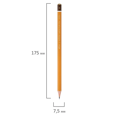 Карандаш длиной 175 мм поставляется заточенным, без ластика. Грифель диаметром 2 мм и твердостью H.
