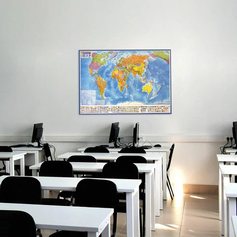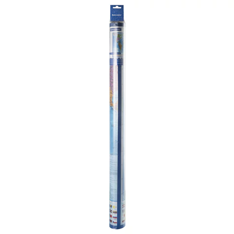 Настенная карта мира с масштабом 1:28 000 000 обладает размером 117х80 см. Выполнена из ламинированной бумаги плотностью 170 г/м2. Поставляется в упаковке с европодвесом.