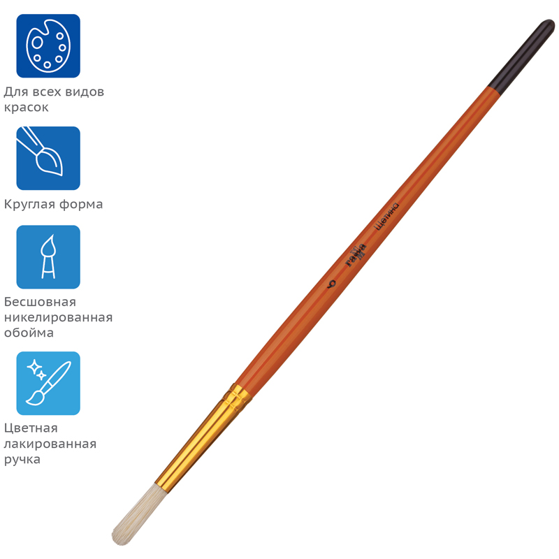 Кисти ГАММА из волоса щетины серии «Классическая» ценятся своей упругостью и жёсткостью. Ещё одним важным свойством является расщеплённый кончик, который способствует хорошей наполняемости кисти и ровному нанесению краски. Кисть круглой формы с короткой ручкой из дерева предназначена для работ с «тяжёлыми красками»: маслом, акрилом, темперой, гуашью. Натуральные кисти из щетины - отличный инструмент как для детского и школьного творчества, так для хобби и профессиональной живописи. Ручка кисти изготовлена из берёзы и покрыта глянцевым лаком. Цельнометаллическая бесшовная обойма обеспечивает надёжное соединение ручки и волосяного пучка.