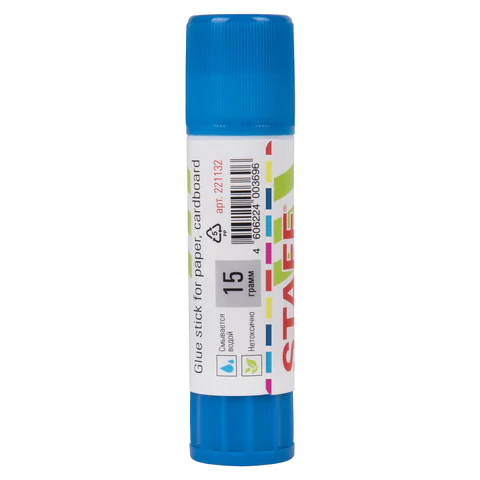 Объем - 15 г. Клей-карандаш STAFF легко наносится и распределяется по поверхности. Не токсичен и безопасен для здоровья. Удобен в использовании: он не пачкает руки, стол, одежду; легко удаляется при помощи воды. Плотно прилегающий колпачок предотвращает высыхание клея. Срок годности - 3 года.