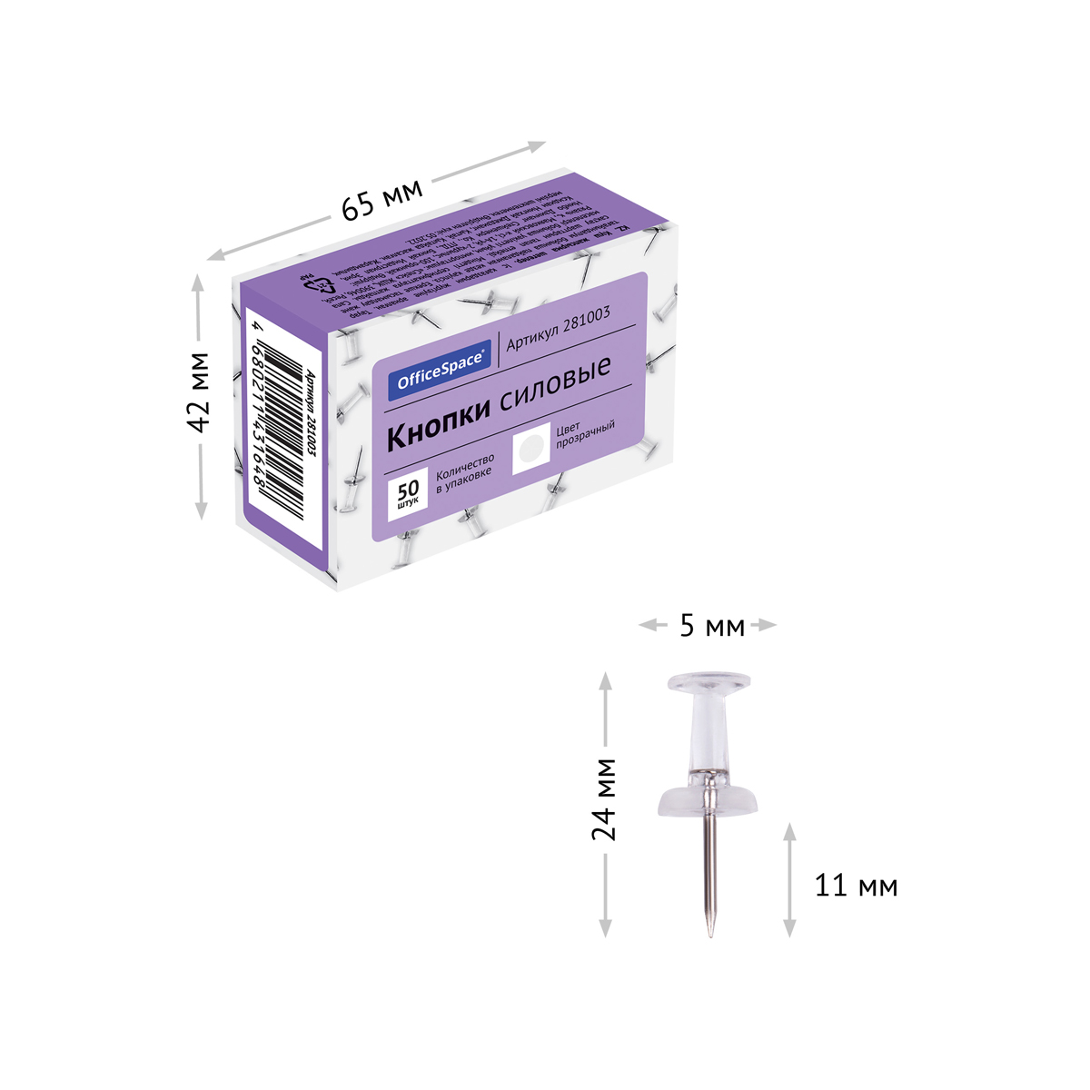 Силовые кнопки OfficeSpace с прозрачными шляпками предназначены для создания отметок на картах, графиках и для крепления информации к пробковым доскам. Длина иглы – 11 мм. Упакованы по 50 штук в картонную коробку, размер кнопки 24*5 мм.