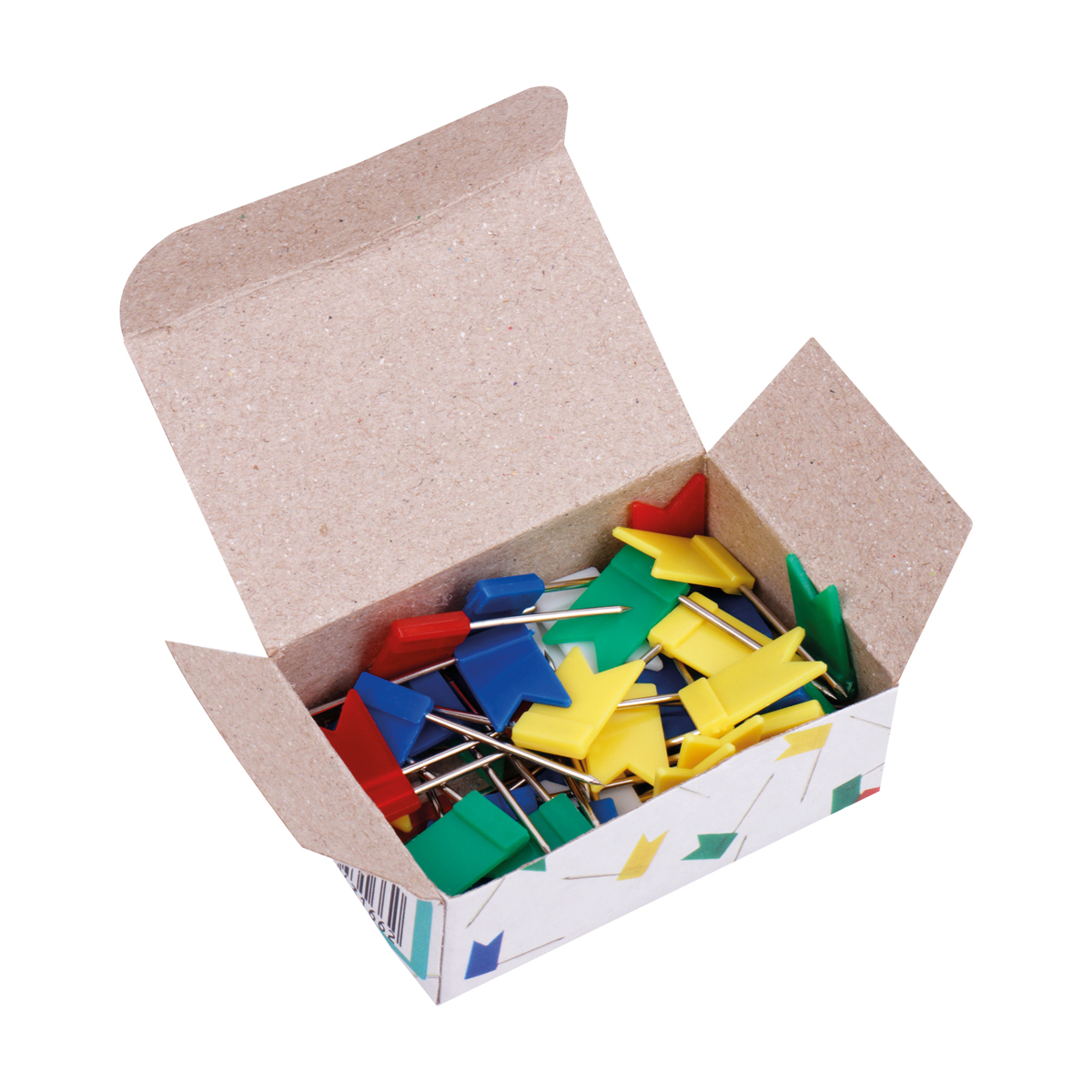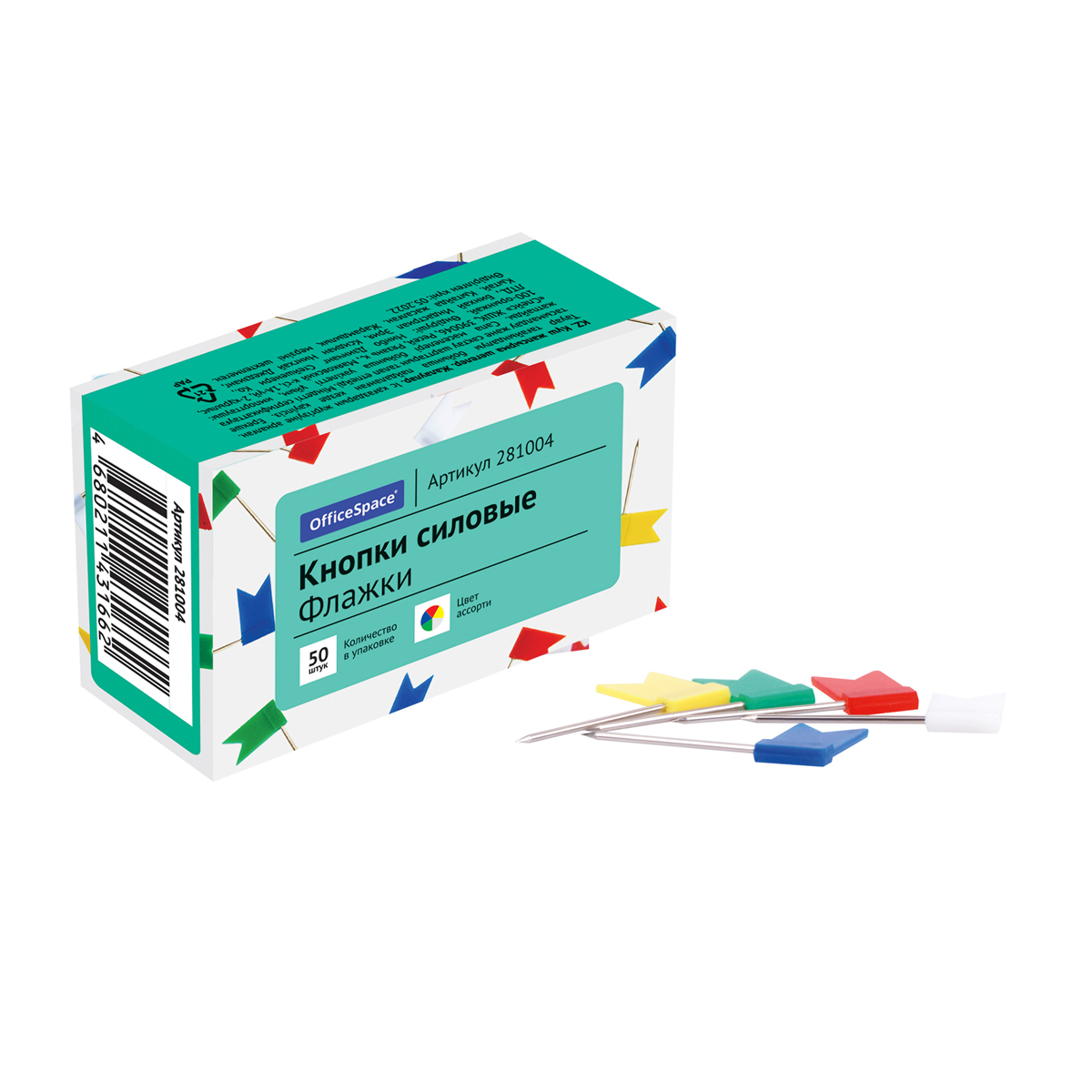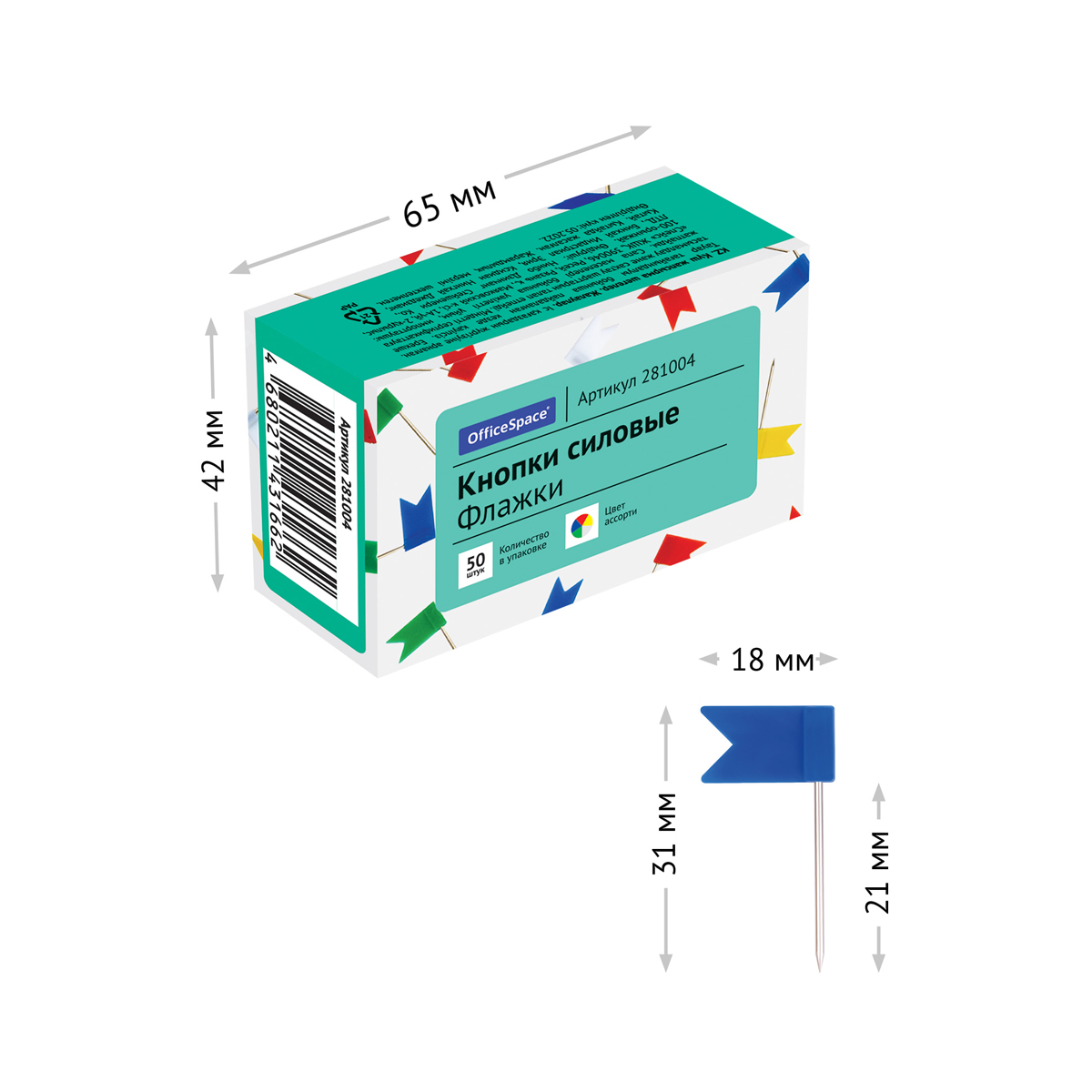 Силовые кнопки OfficeSpace разного цвета в форме флажков предназначены для создания отметок на картах, графиках и для крепления информации к пробковым доскам. Длина иглы – 21 мм. Упакованы по 50 штук в картонную коробку, размер кнопки 31*18 мм.