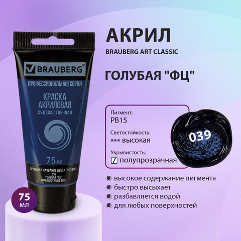 Художественная акриловая краска BRAUBERG ART "CLASSIC" предназначена для живописи и декоративных работ. Используется при работе почти на любой поверхности: бумаге, картоне, холсте, дереве, коже.