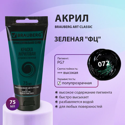 Художественная акриловая краска BRAUBERG ART "CLASSIC" предназначена для живописи и декоративных работ. Используется при работе почти на любой поверхности: бумаге, картоне, холсте, дереве, коже.