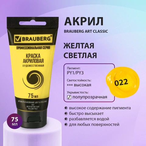 Художественная акриловая краска BRAUBERG ART "CLASSIC" предназначена для живописи и декоративных работ. Используется при работе почти на любой поверхности: бумаге, картоне, холсте, дереве, коже.