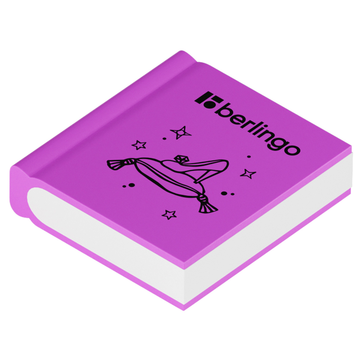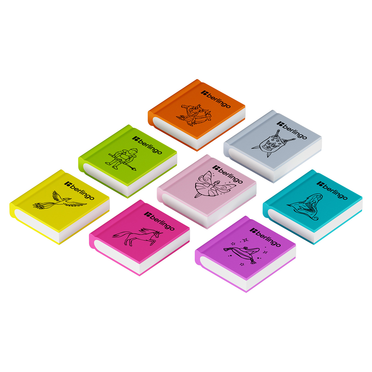 Ластик выполнен из мягкой термопластичной резины в форме книжки. Каждый ластик имеет штрихкод. Ластики упакованы в дисплей. 8 ярких цветов ассорти.