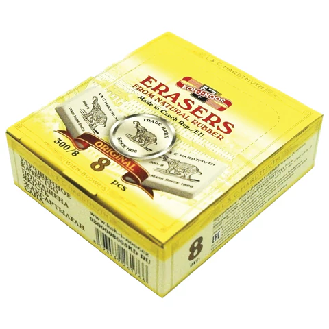 Ластик производятся только из натурального каучука. Ластик мягкий, не повреждает бумагу, обеспечивает чистое и аккуратное стирание. Идеально удаляют следы мягких, средних и твердых чернографитных карандашей на любой поверхности.