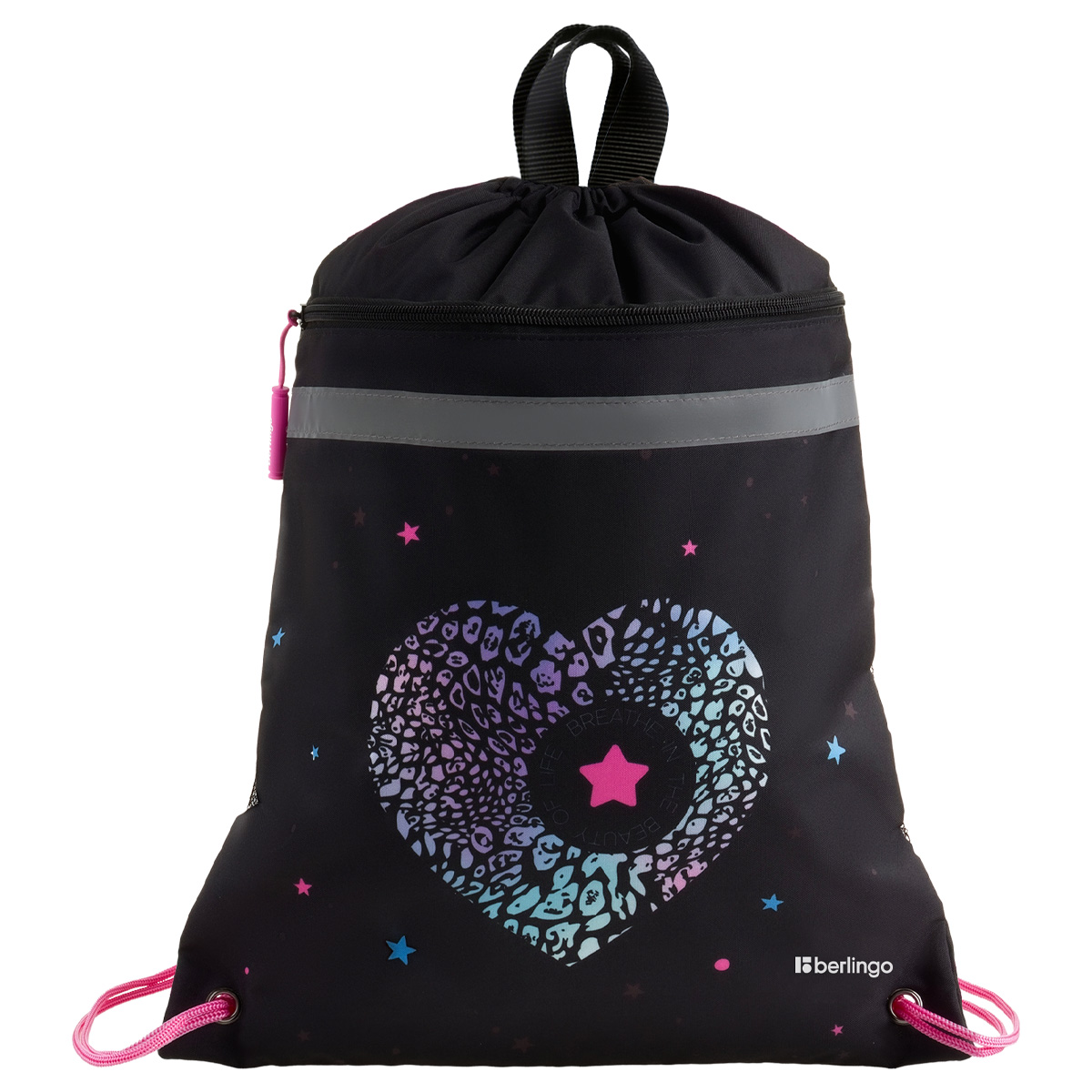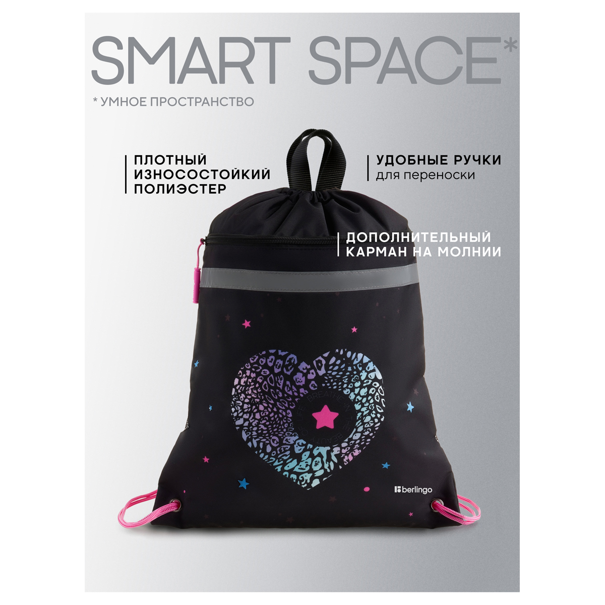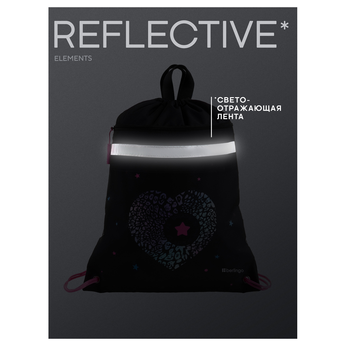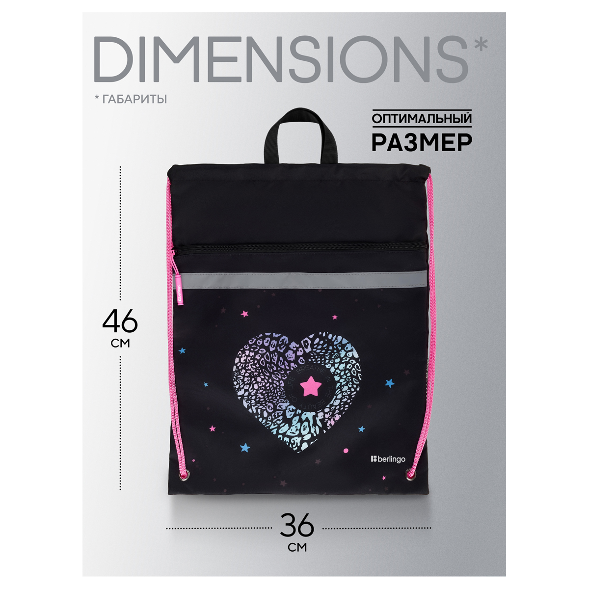 Вместительный мешок для обуви Berlingo оснащён прочными шнурками, светоотражающей полосой, вентиляционной сеточкой, передним карманом на молнии и петлей для подвешивания, а также имеет бирку для подписи имени, класса и телефона. Размер изделия 360*460 мм. Модель изготовлена из плотного полиэстера. Световозвращающие элементы обезопасят ребенка в тёмное время суток. Мешок идеален как для зимней обуви, так и для спортивной экипировки. Индивидуальная упаковка - пакет.
