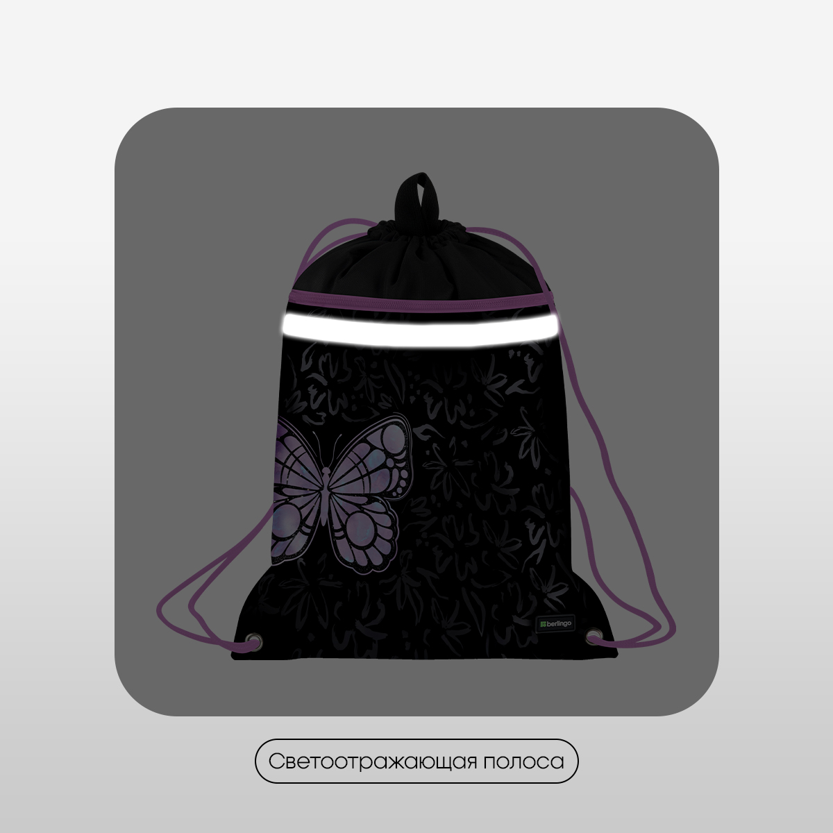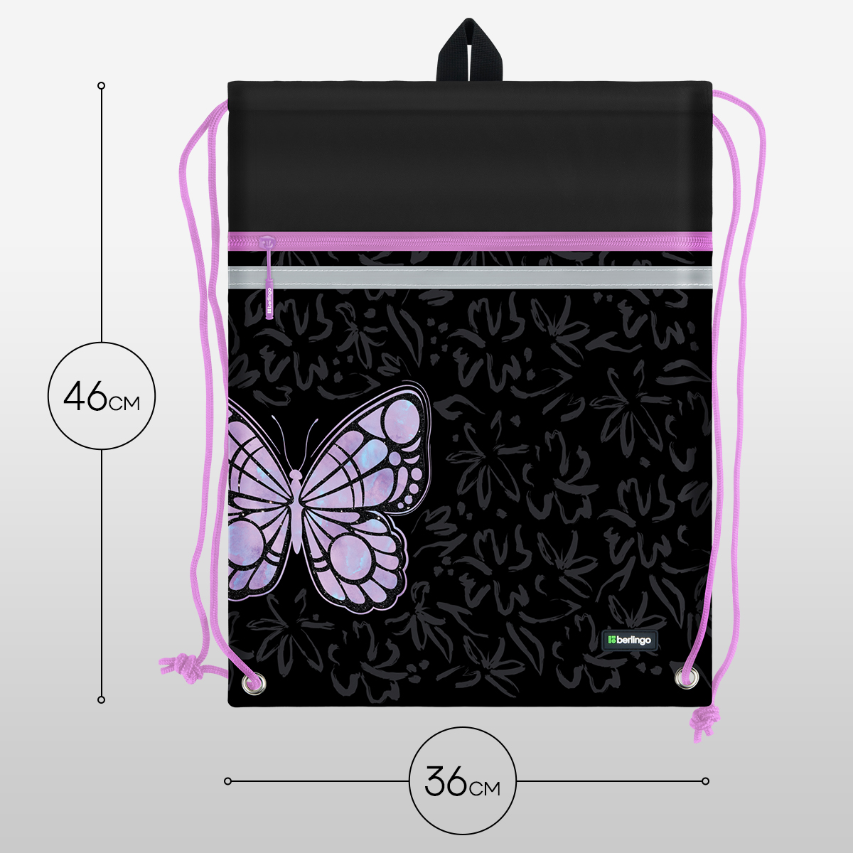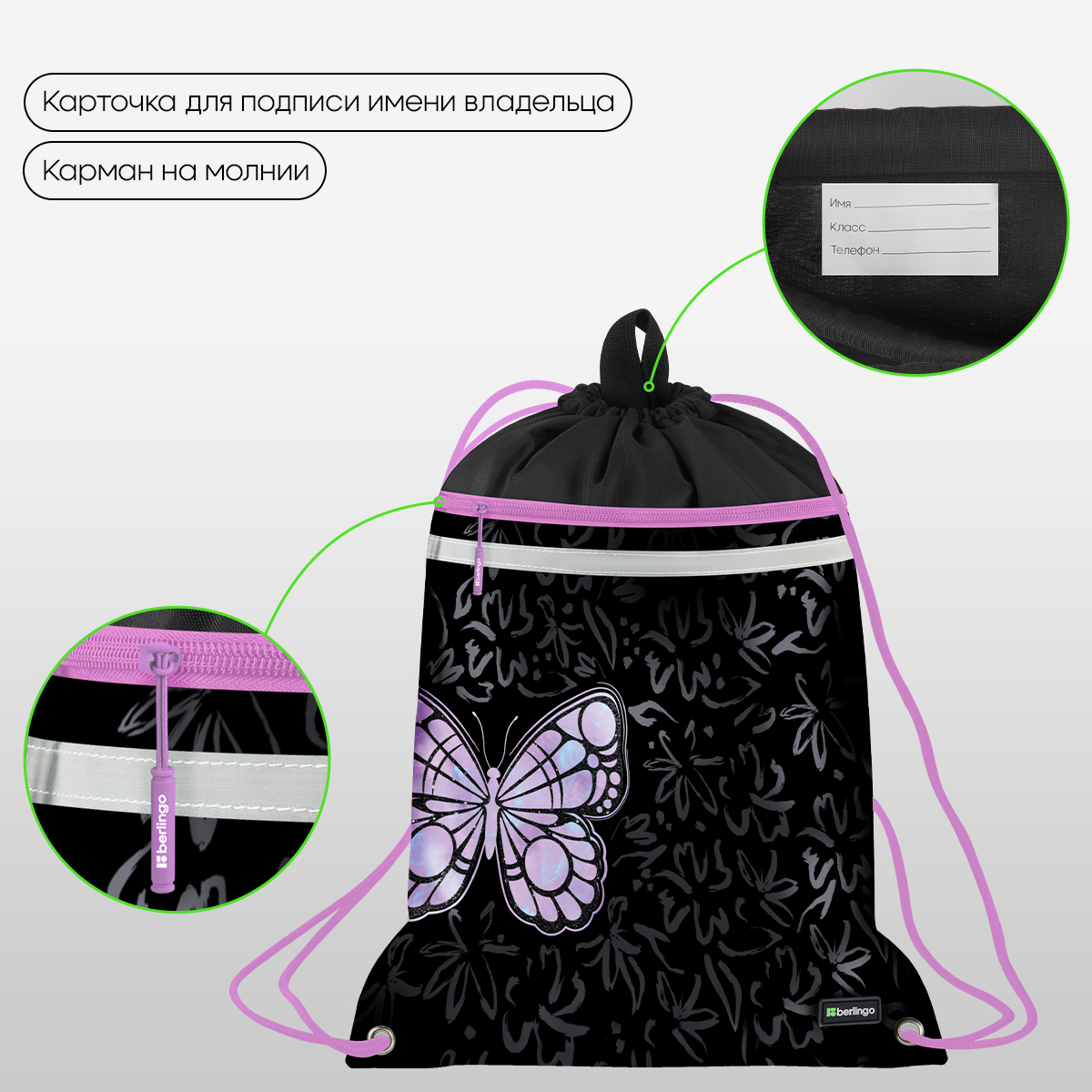 Вместительный мешок для обуви Berlingo оснащён прочными шнурками, светоотражающей полосой, вентиляционной сеточкой, передним карманом на молнии и петлей для подвешивания, а также имеет бирку для подписи имени, класса и телефона. Размер изделия 360*460 мм. Модель изготовлена из плотного полиэстера. Световозвращающие элементы обезопасят ребенка в тёмное время суток. Мешок идеален как для зимней обуви, так и для спортивной экипировки. Индивидуальная упаковка - пакет.