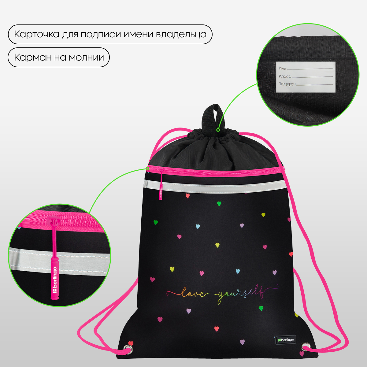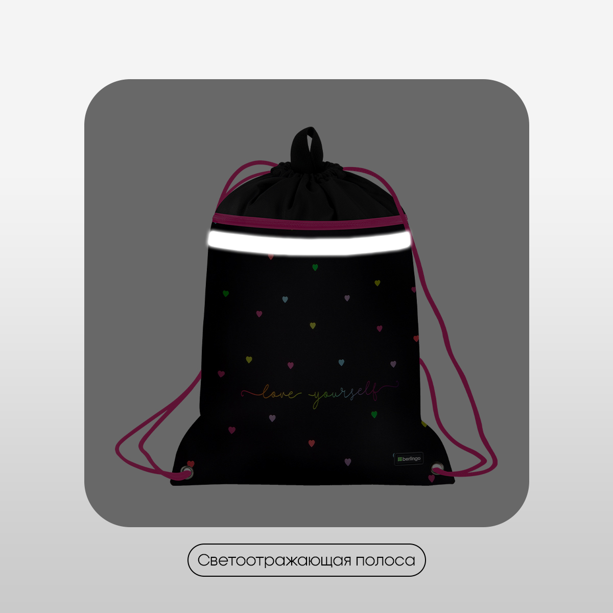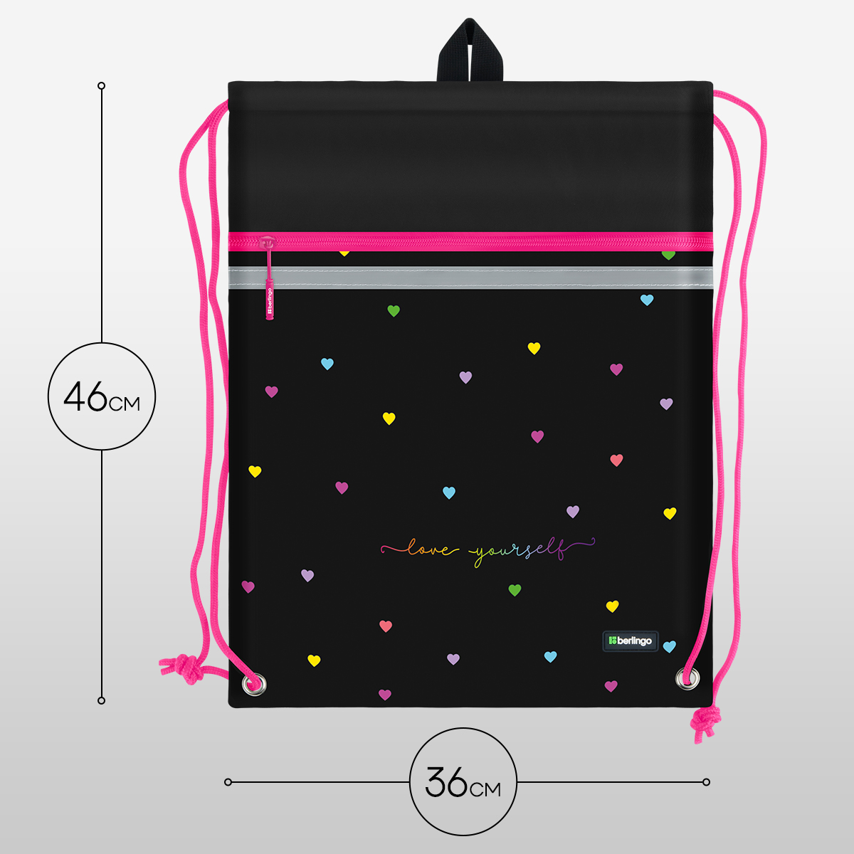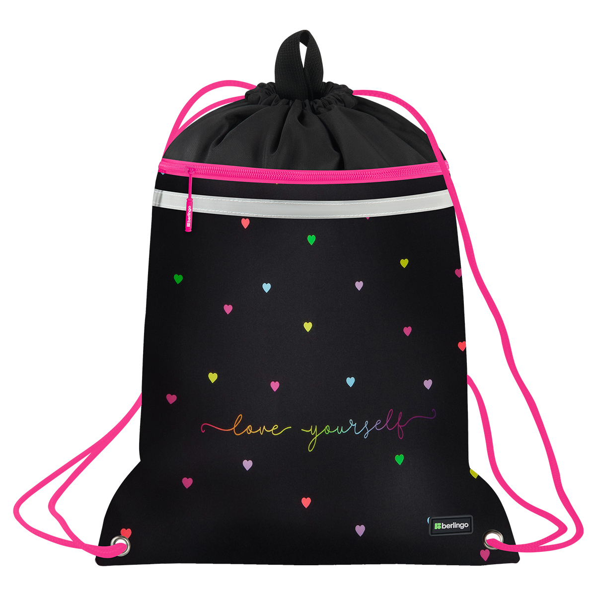 Мешок для обуви 1 отделение Berlingo "Love Yourself", 360*460мм, вентиляционная сеточка , светоотражающая лента, карман на молнии
