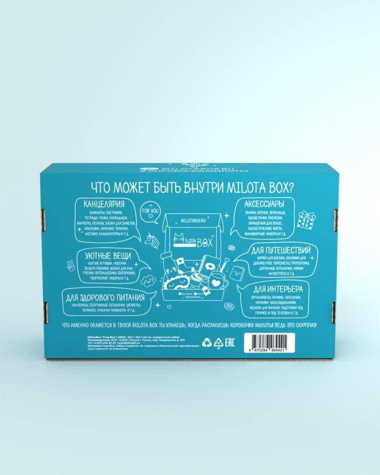 Каждая коробочка милоты наполнена необычными вещицами, которыми будет приятно пользоваться в повседневной жизни: милая канцелярия, уютные товары для дома, стильные аксессуары, предметы для здорового образа жизни и приятные мелочи. Наполнение MilotaBox стало ещё лучше! Больше подарков! Внутри каждого MilotaBox находится до 13 предметов на одну тематику, упакованных в стилизованную бумагу тишью. Коробочка из плотного, дизайнерского картона. Размер коробочки: 28,5 х 18,5 х 9,5 см. Общий вес: 900 гр.