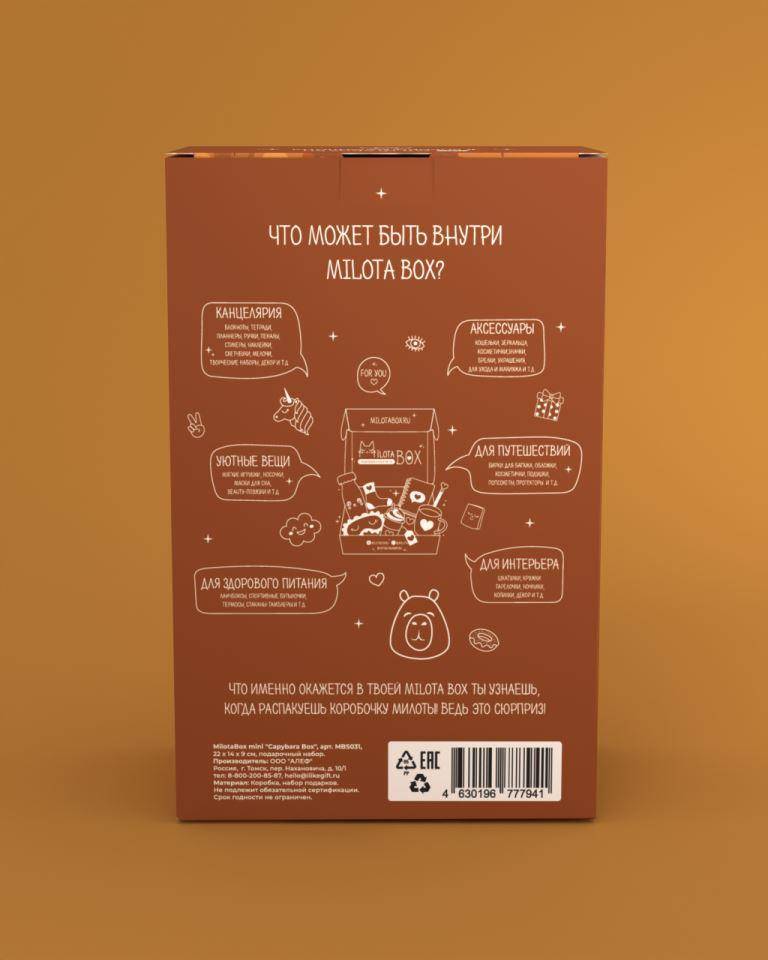 Каждая коробочка милоты наполнена необычными вещицами, которыми будет приятно пользоваться в повседневной жизни: милая канцелярия, уютные товары для дома, стильные аксессуары, предметы для здорового образа жизни и приятные мелочи. Внутри Milota BOX находится до 8 сюрпризов, упакованных в стилизованную подарочную бумагу тишью. Коробочка из плотного, дизайнерского картона. Размер коробочки: 22 х 14 х 9 см. Общий вес: 550 гр.