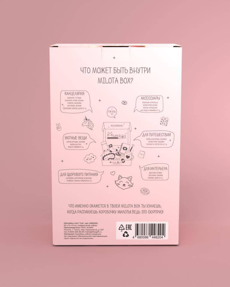 Каждая коробочка милоты наполнена необычными вещицами, которыми будет приятно пользоваться в повседневной жизни: милая канцелярия, уютные товары для дома, стильные аксессуары, предметы для здорового образа жизни и приятные мелочи. Внутри Milota BOX находится до 8 сюрпризов, упакованных в стилизованную подарочную бумагу тишью. Коробочка из плотного, дизайнерского картона. Размер коробочки: 22 х 14 х 9 см. Общий вес: 550 гр.