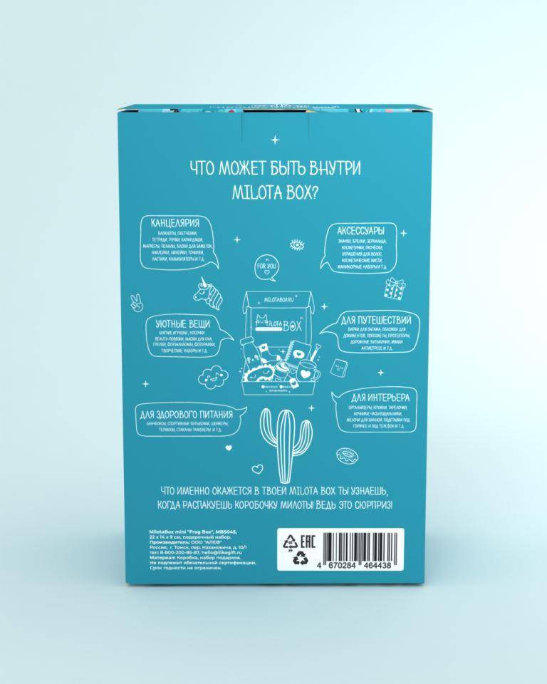 Каждая коробочка милоты наполнена необычными вещицами, которыми будет приятно пользоваться в повседневной жизни: милая канцелярия, уютные товары для дома, стильные аксессуары, предметы для здорового образа жизни и приятные мелочи. Внутри Milota BOX находится до 8 сюрпризов, упакованных в стилизованную подарочную бумагу тишью. Коробочка из плотного, дизайнерского картона. Размер коробочки: 22 х 14 х 9 см. Общий вес: 550 гр.