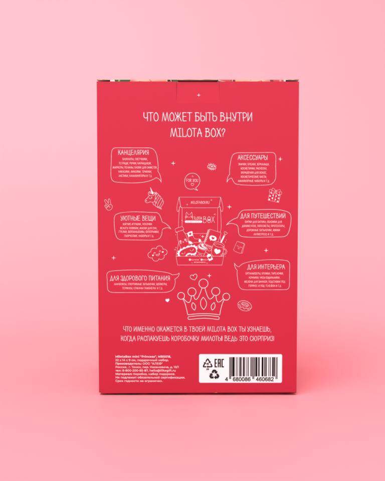 Каждая коробочка милоты наполнена необычными вещицами, которыми будет приятно пользоваться в повседневной жизни: милая канцелярия, уютные товары для дома, стильные аксессуары, предметы для здорового образа жизни и приятные мелочи. Внутри Milota BOX находится до 8 сюрпризов, упакованных в стилизованную подарочную бумагу тишью. Коробочка из плотного, дизайнерского картона. Размер коробочки: 22 х 14 х 9 см. Общий вес: 550 гр.