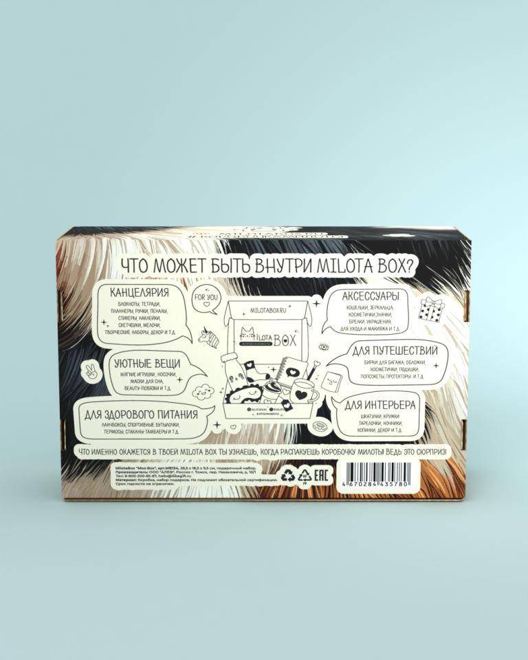 Каждая коробочка милоты наполнена необычными вещицами, которыми будет приятно пользоваться в повседневной жизни: милая канцелярия, уютные товары для дома, стильные аксессуары, предметы для здорового образа жизни и приятные мелочи. Наполнение MilotaBox стало ещё лучше! Больше подарков! Внутри каждого MilotaBox находится до 13 предметов на одну тематику, упакованных в стилизованную бумагу тишью. Коробочка из плотного, дизайнерского картона. Размер коробочки: 28,5 х 18,5 х 9,5 см. Общий вес: 900 гр.