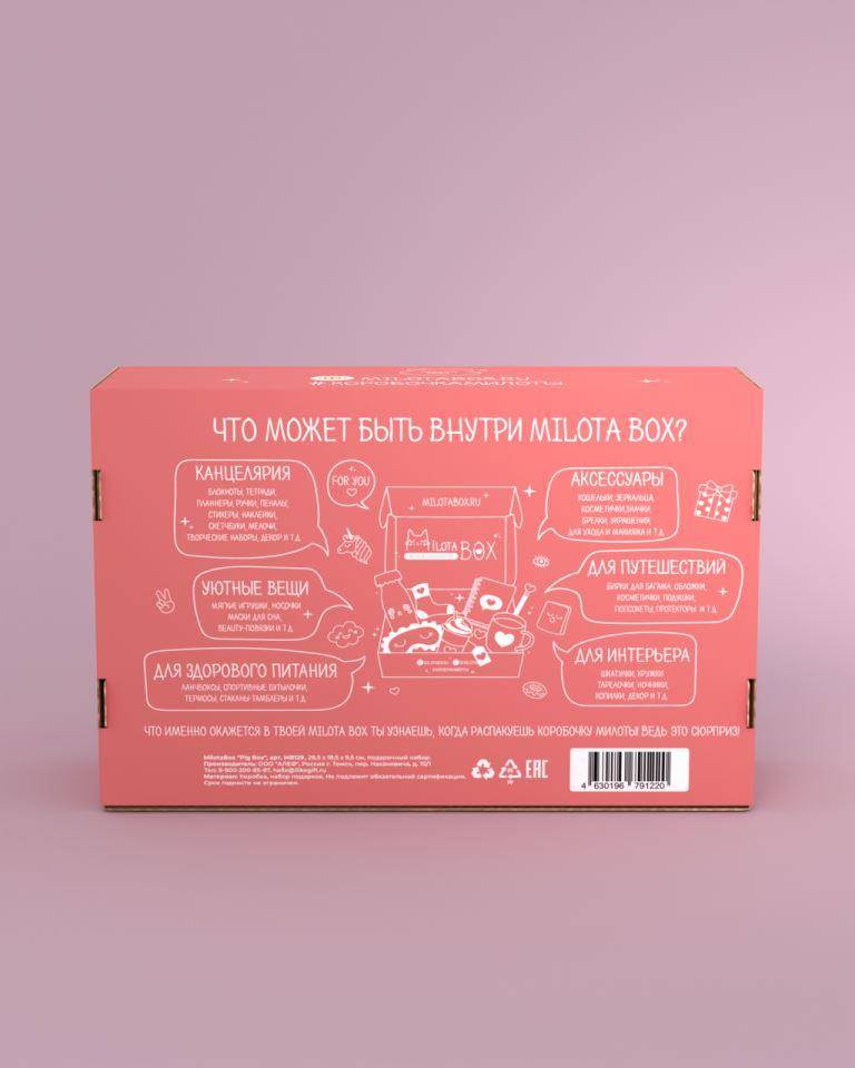 Каждая коробочка милоты наполнена необычными вещицами, которыми будет приятно пользоваться в повседневной жизни: милая канцелярия, уютные товары для дома, стильные аксессуары, предметы для здорового образа жизни и приятные мелочи. Наполнение MilotaBox стало ещё лучше! Больше подарков! Внутри каждого MilotaBox находится до 13 предметов на одну тематику, упакованных в стилизованную бумагу тишью. Коробочка из плотного, дизайнерского картона. Размер коробочки: 28,5 х 18,5 х 9,5 см. Общий вес: 900 гр