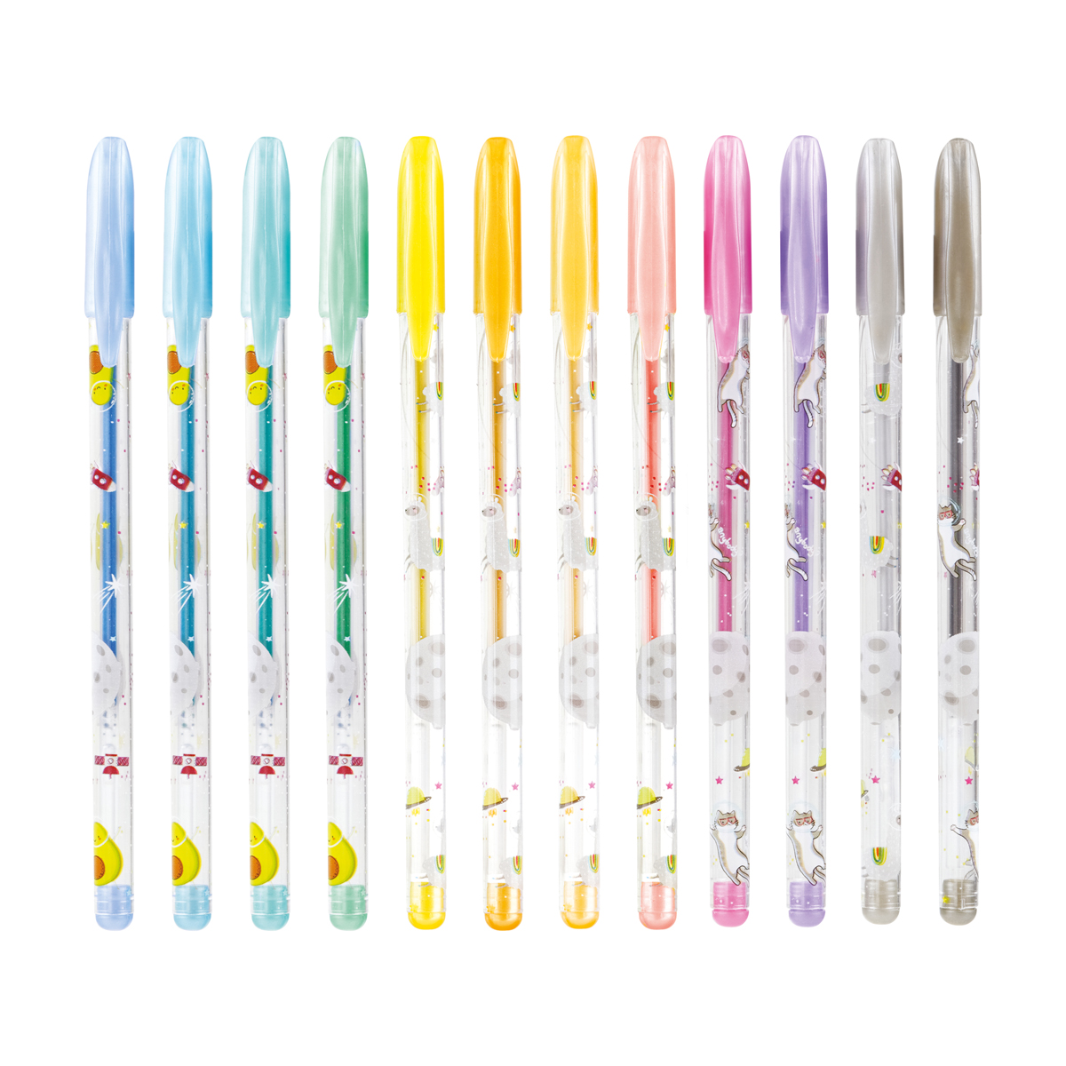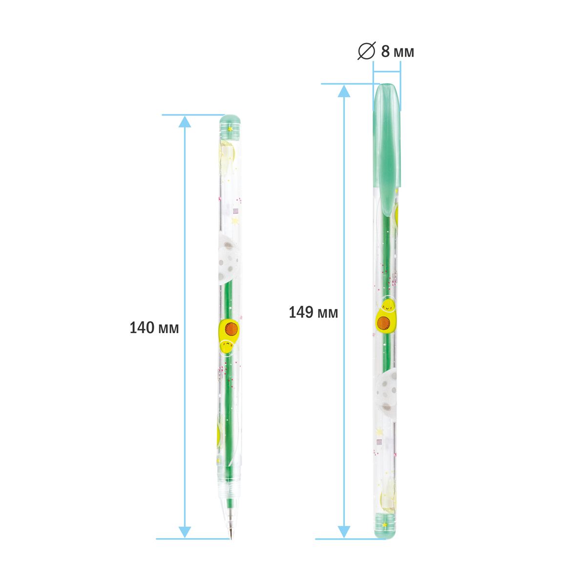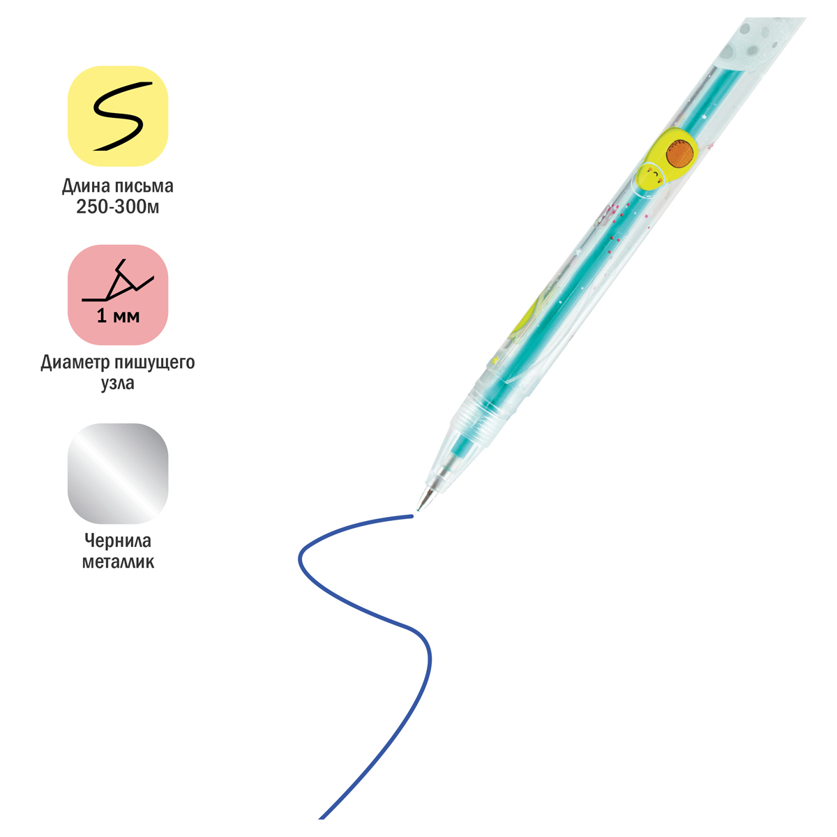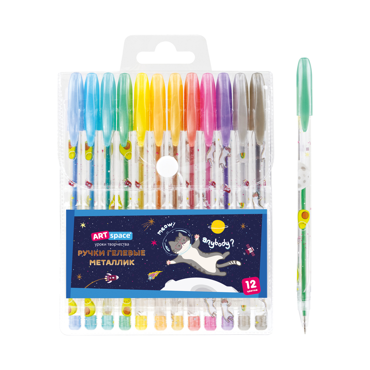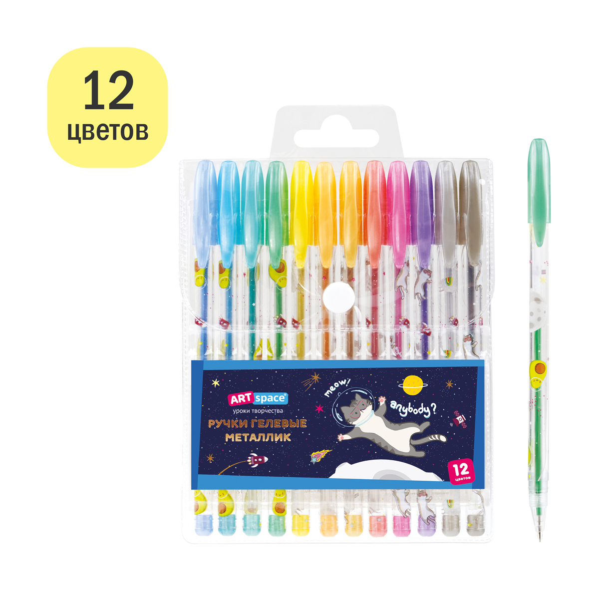 Набор гелевых ручек с чернилами металлик, 12 цветов, пищущий узел — 1 мм, упакованы в ПВХ чехол с европодвесом размерами 17,5х12х1,5 мм. Длина ручки с колпачком 149 мм, без колпачка 140 мм, длина стержня 130 мм. Диаметр корпуса 8 мм. Длина письма 1 ручки 250 - 300 м. Перед использованием рекомендовано встряхнуть ручку вниз пишущим узлом.