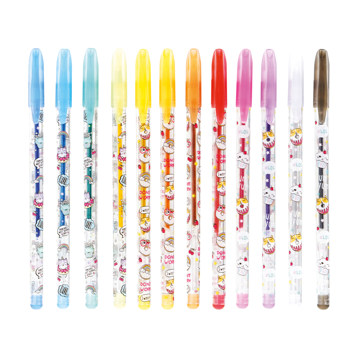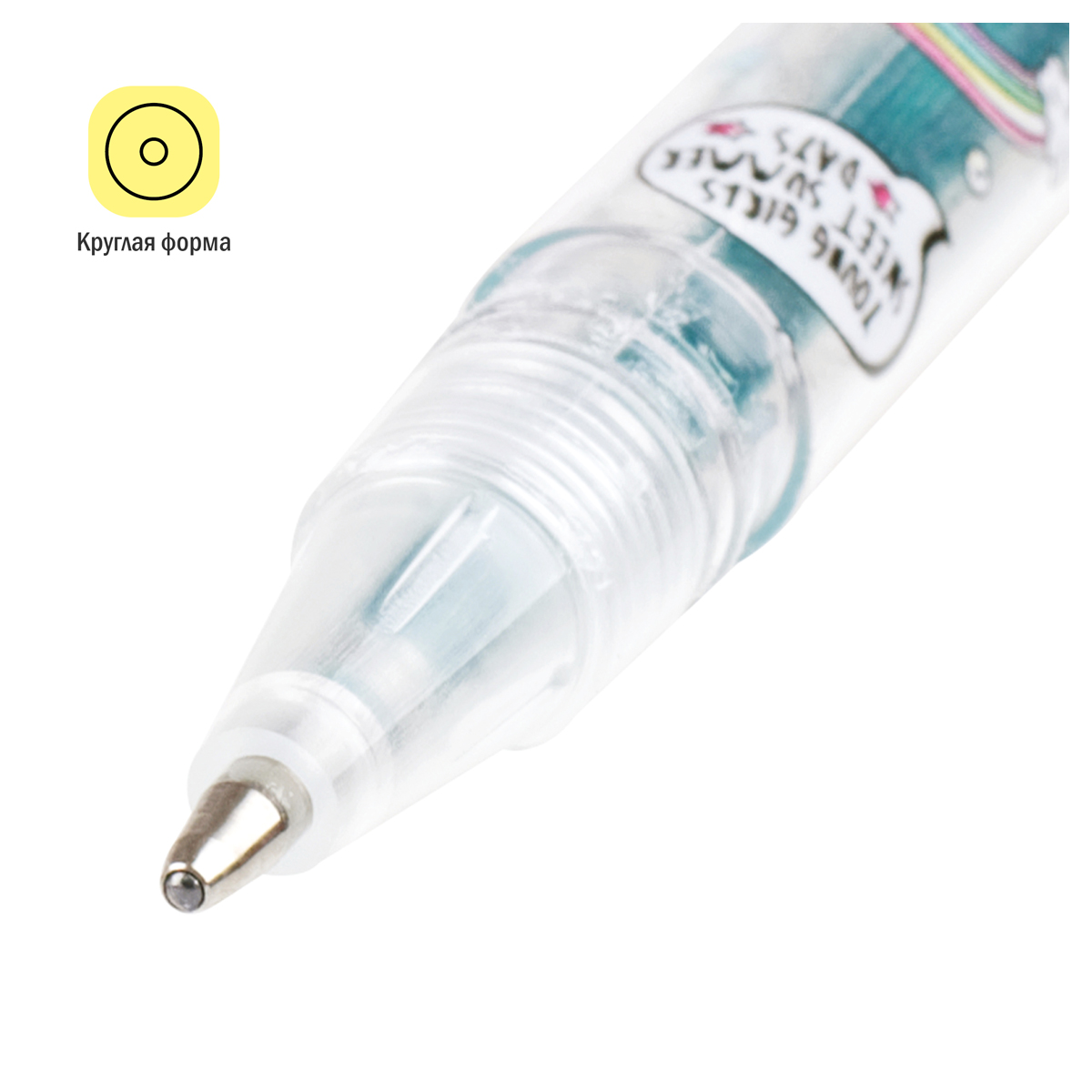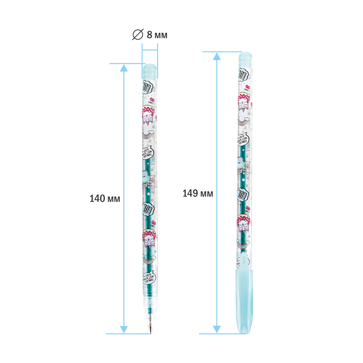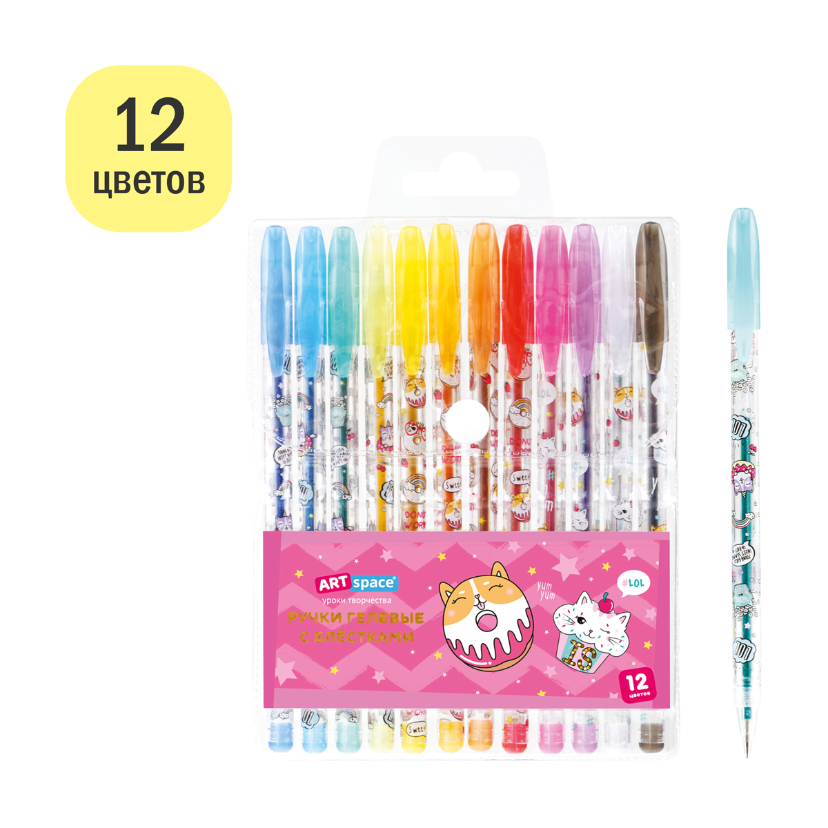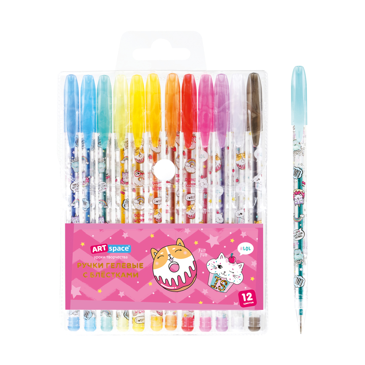 Набор гелевых ручек с глиттером, 12 цв., цвет чернил — ассорти, в блистере с ероподвесом размерами 17,5х12х1,5 мм. Длина ручки с колпачком 149 мм, без колпачка 140 мм, длина стержня 130 мм. Диаметр корпуса 8 мм. Длина письма 1 ручки 250 - 300 м. Перед использованием рекомендовано встряхнуть ручку вниз пишущим узлом.