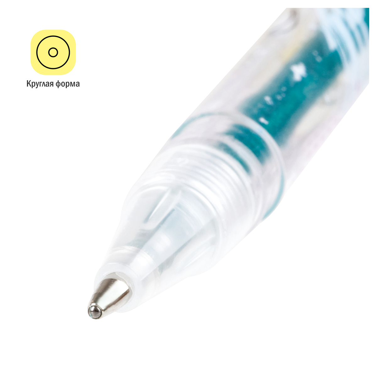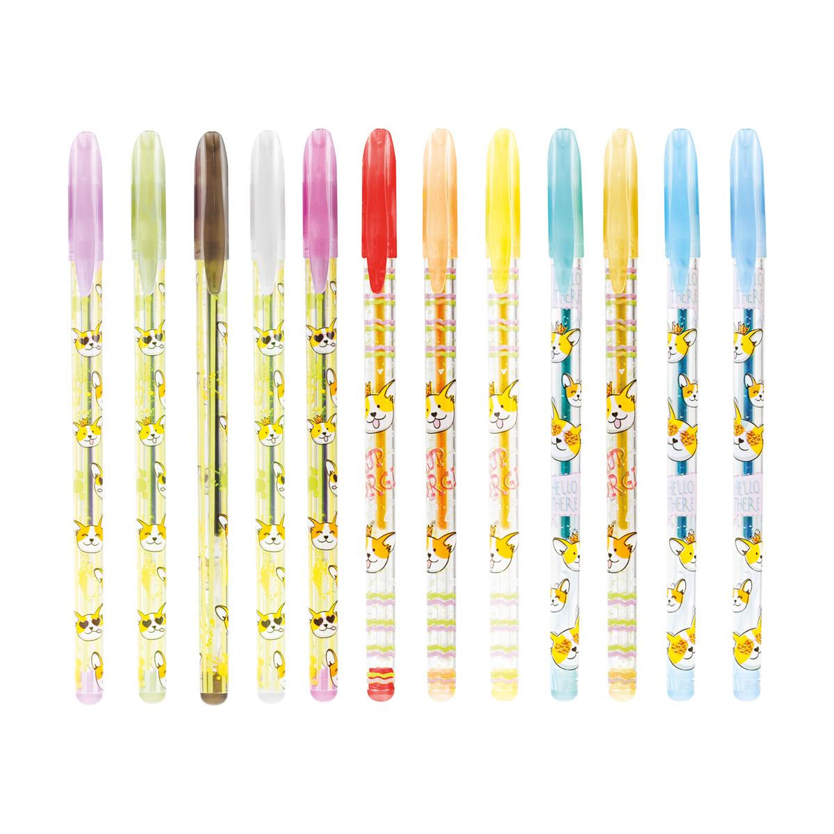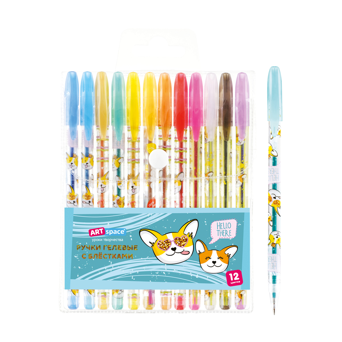 Набор гелевых ручек с глиттером, 12 цв., цвет чернил — ассорти, в блистере с ероподвесом размерами 17,5х12х1,5 мм. Длина ручки с колпачком 149 мм, без колпачка 140 мм, длина стержня 130 мм. Диаметр корпуса 8 мм. Длина письма 1 ручки 250 - 300 м. Перед использованием рекомендовано встряхнуть ручку вниз пишущим узлом.