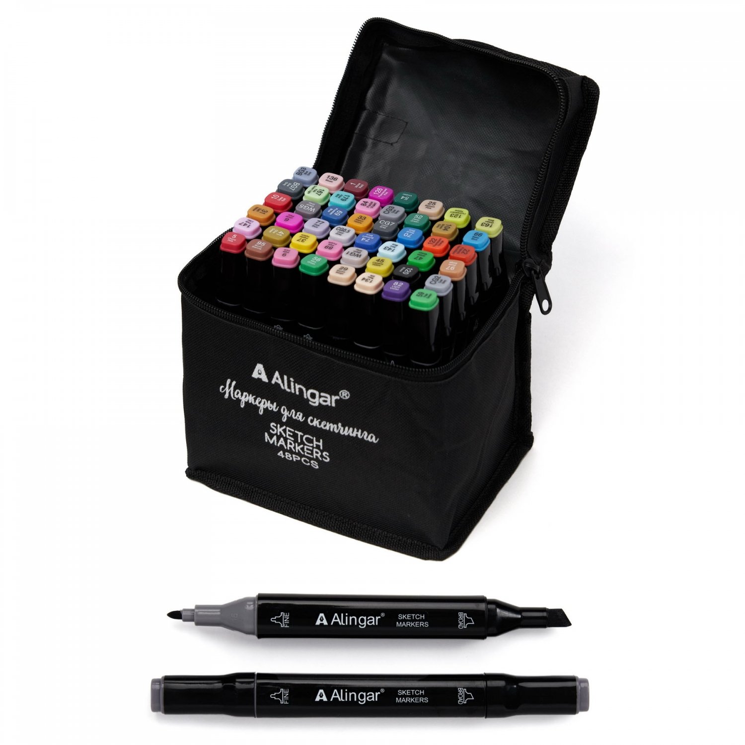 Набор скетчмаркеров DUO Alingar, 48 цветов, пулевид./клиновид 1-6 мм, сечение корпуса квадрат, спирт. осн, сумка-чехол с ПВХ каркас-ячейкам