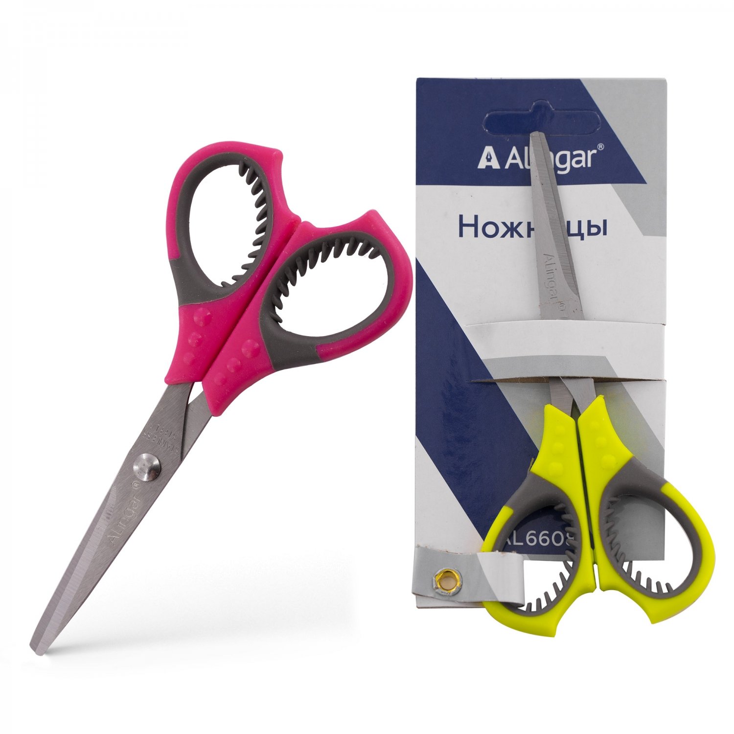 Ножницы канцелярские, Alingar, 14 см., пластиковые ручки, прорезиненная вставка, закругленные концы, ассорти (голубой, розовый, зеленый), европодвес