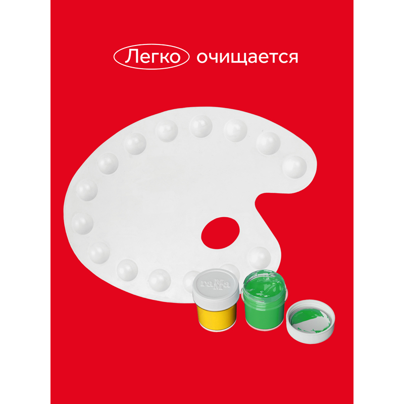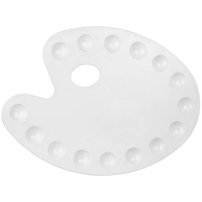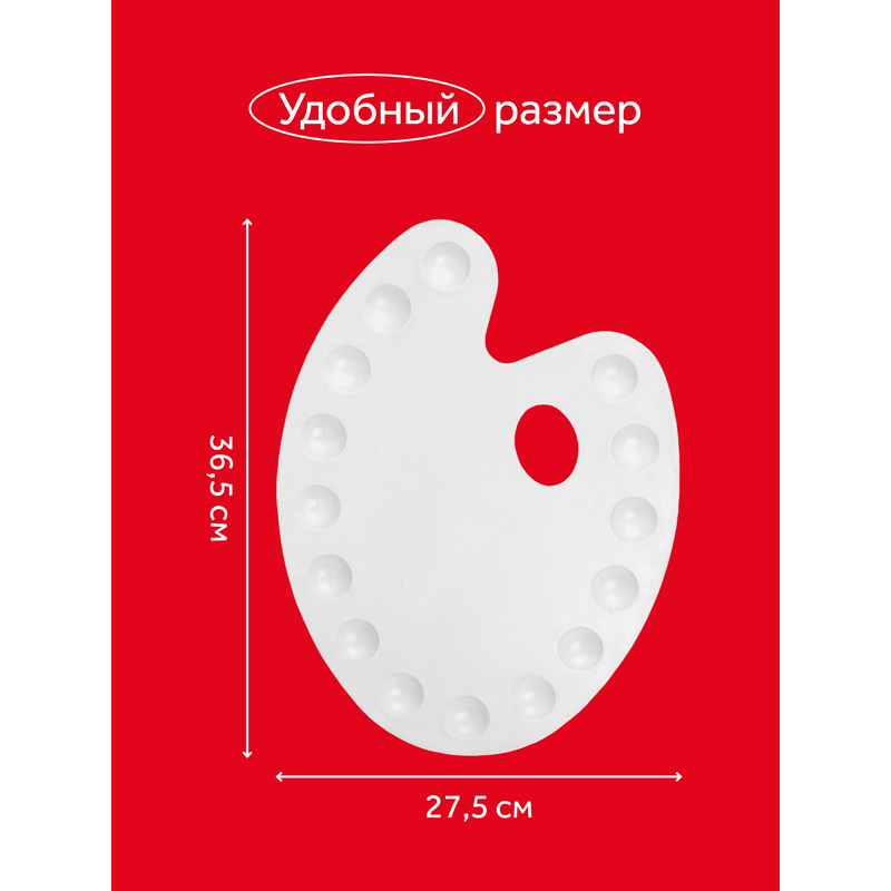 Большая овальная палитра для рисования ГАММА – отличный инструмент для смешивания красок и получения новых тонов при создании рисунка. Она представлена в размере 27*36,5*1,2 см и имеет 15 ячеек. Художественная палитра изготовлена из пластика, у неё безупречно гладкая поверхность белого цвета. Она легко отмывается после использования. С помощью палитры дети учатся смешивать цвета и развивать цветовосприятие.