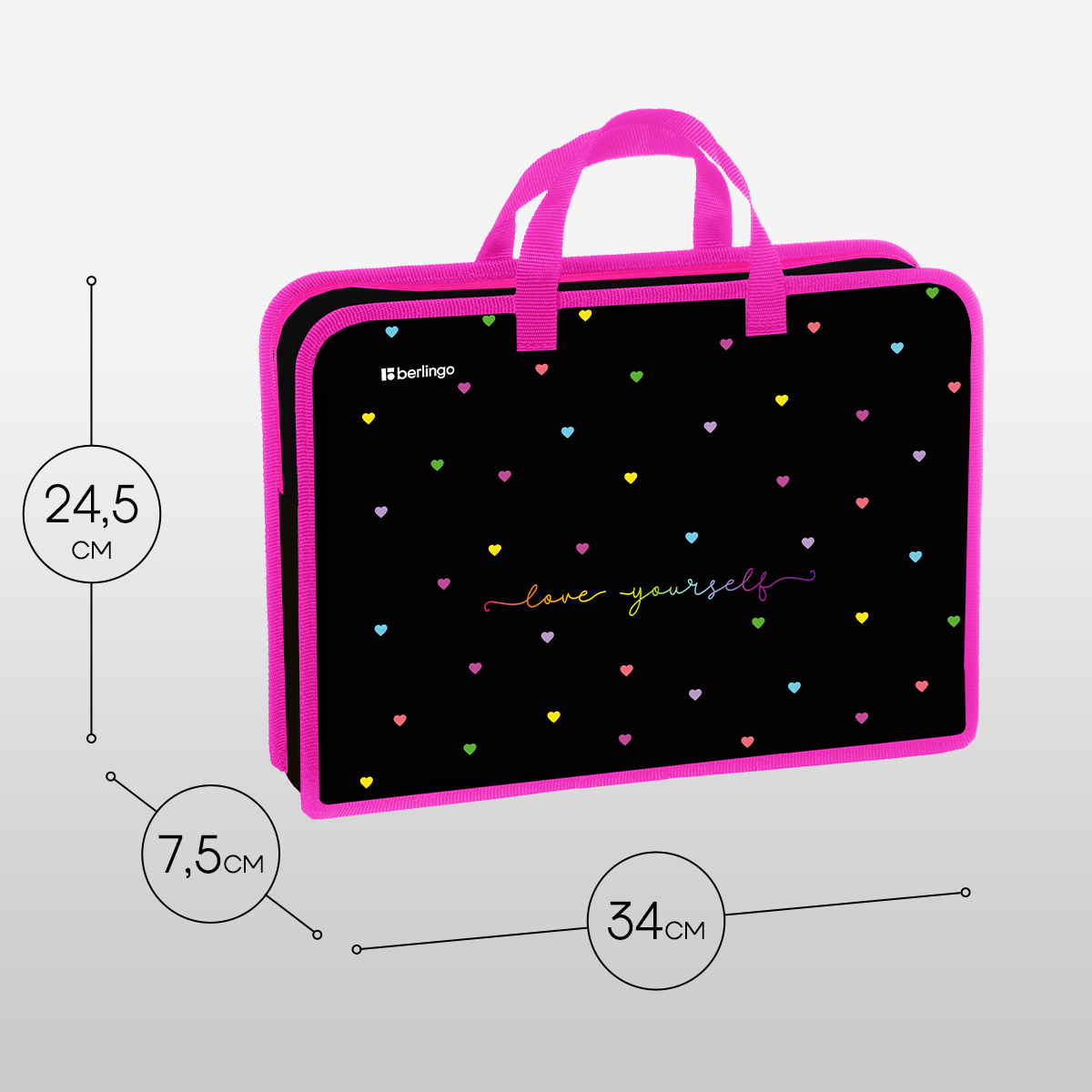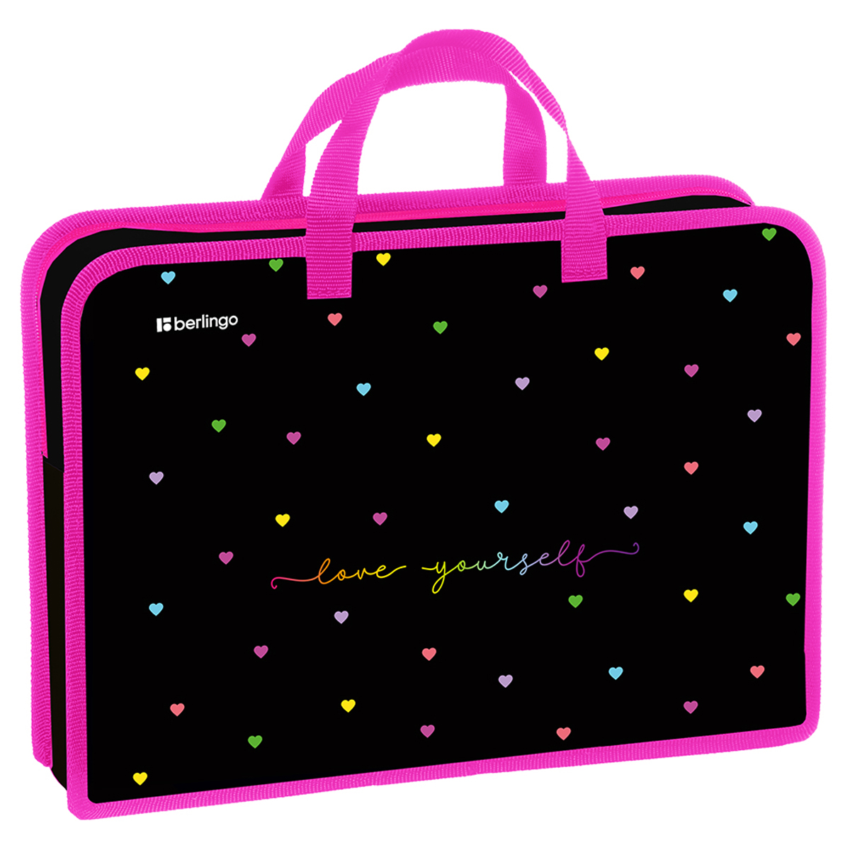 Школьная папка Berlingo серии Love Yourself c ручками и одним отделением поможет поддерживать аккуратный внешний вид тетрадей, альбомов и учебных пособий. Формат изделия — А4 (340*245*75 мм). Папка изготовлена из высококачественного пластика, который защищает содержимое от влаги, грязи и замятия. Края укреплены контрастной тканевой окантовкой. Застёжка-молния расположена по верхнему краю изделия. Наличие ручек из тесьмы обеспечивает удобную транспортировку. Оформление изделия обязательно понравится ребёнку.