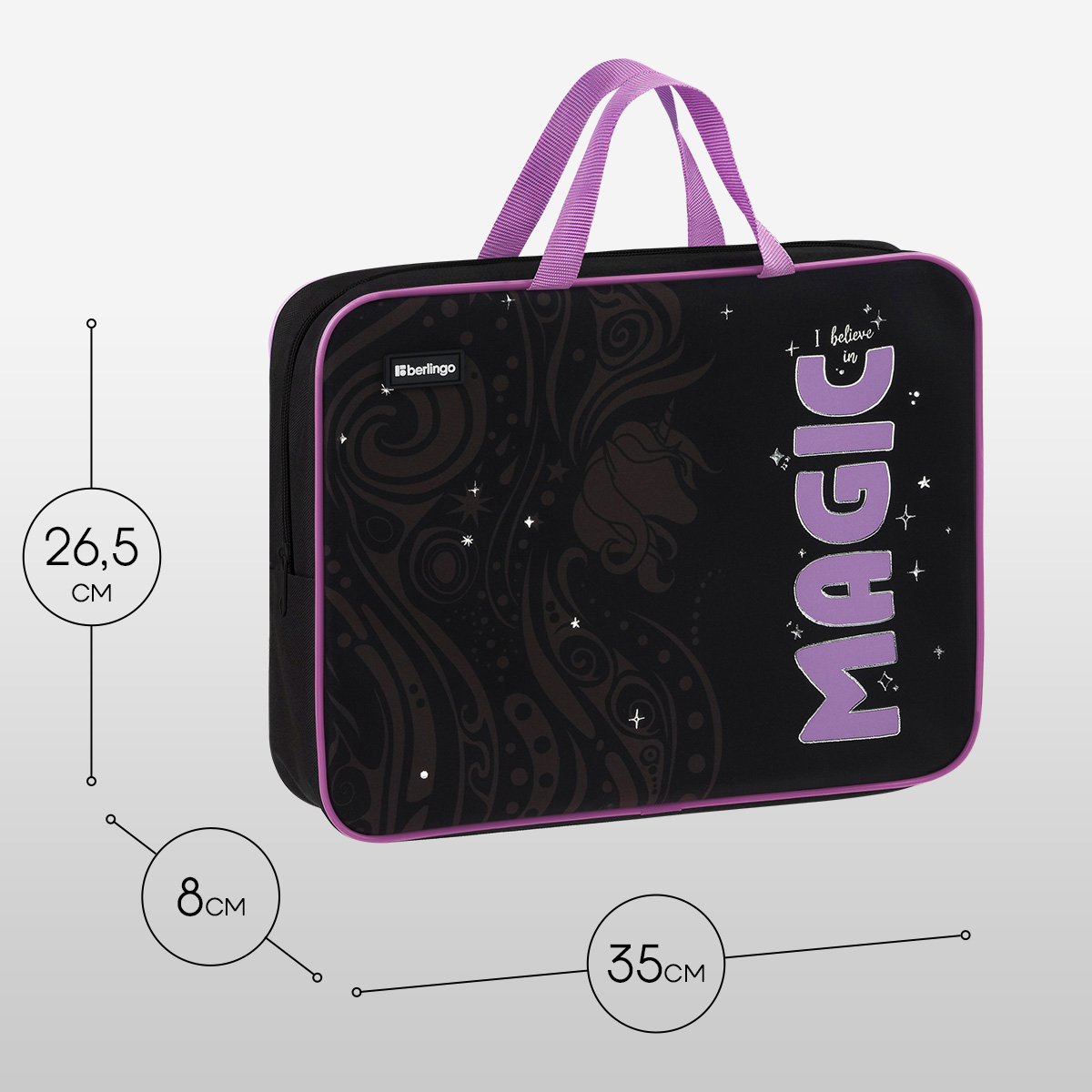 Папка с ручками на молнии для тетрадей Berlingo Purple Magic формата А4 станет стильным помощником в учёбе, предназначена для хранения документов. Изделие размера 350*265*80 мм имеет одно отделение и карман внутри. Застежка-молния сверху надежно защищает содержимое от грязи и влаги. Наличие ручек обеспечивает удобную транспортировку. Папка предназначена для тетрадей, альбомов и прочих канцелярских принадлежностей, имеет увеличенную ширину торцевой стороны, что позволяет вместить все необходимое. Оформление папки непременно понравится девочке.
