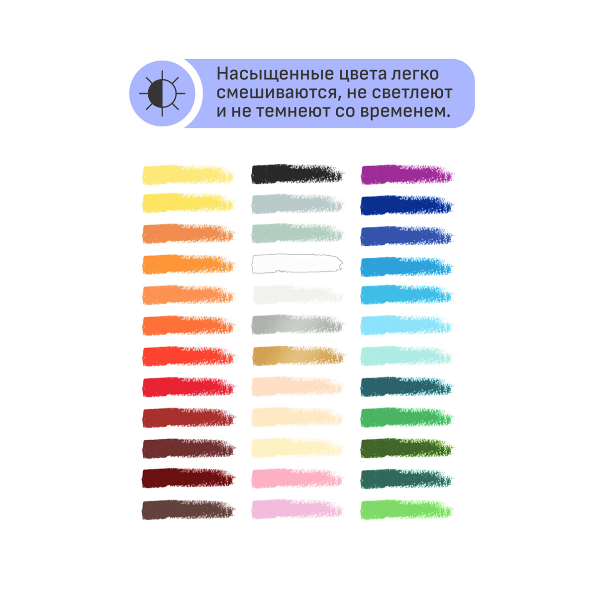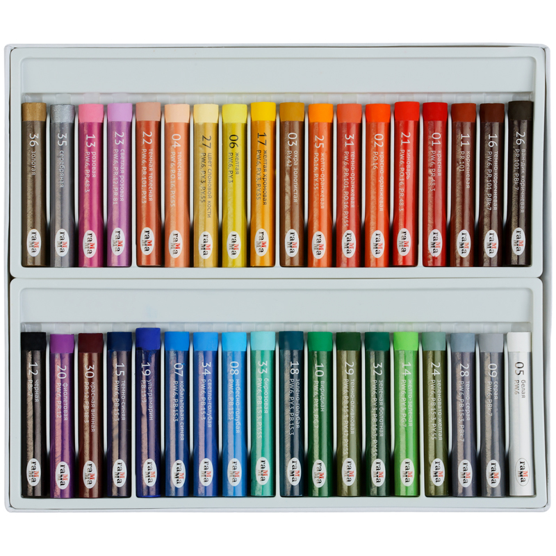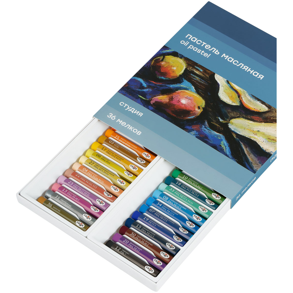 Масляная пастель «Студия» изготовлена на основе тонкотертых пигментов и минерального масла. Оставляет мягкий штрих, легко растушевывается. Яркие насыщенные цвета легко смешиваются, не светлеют и не темнеют со временем. Масляная пастель рисует на поверхностях разных фактур, не осыпается и не требует использования закрепителя краски.