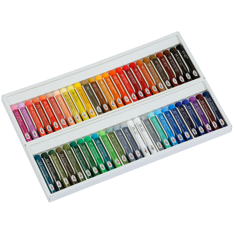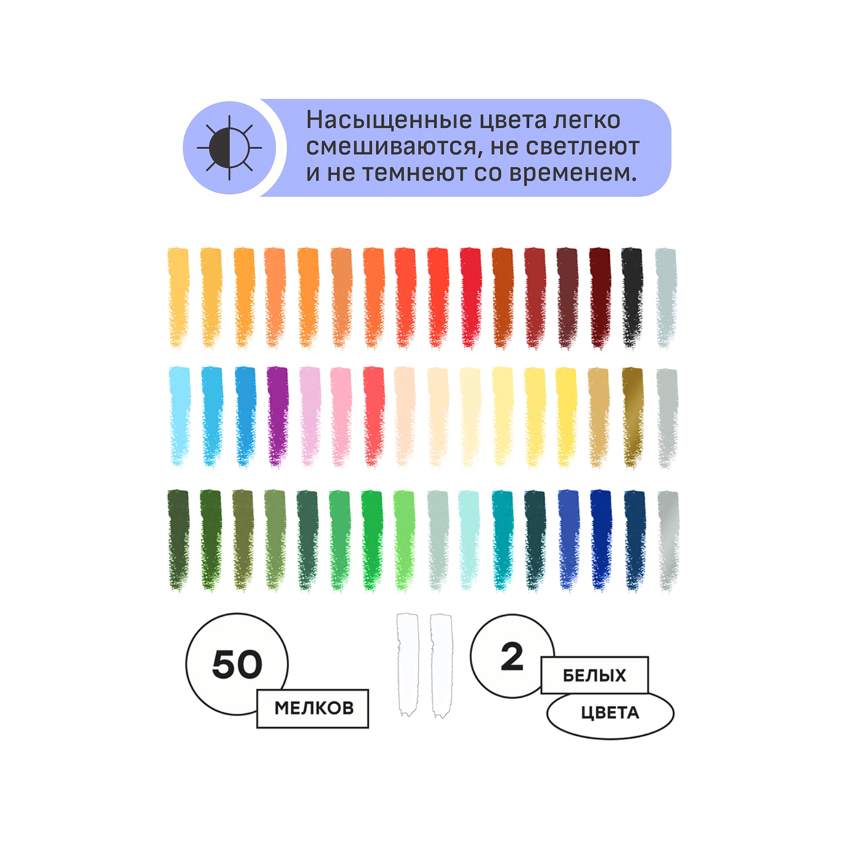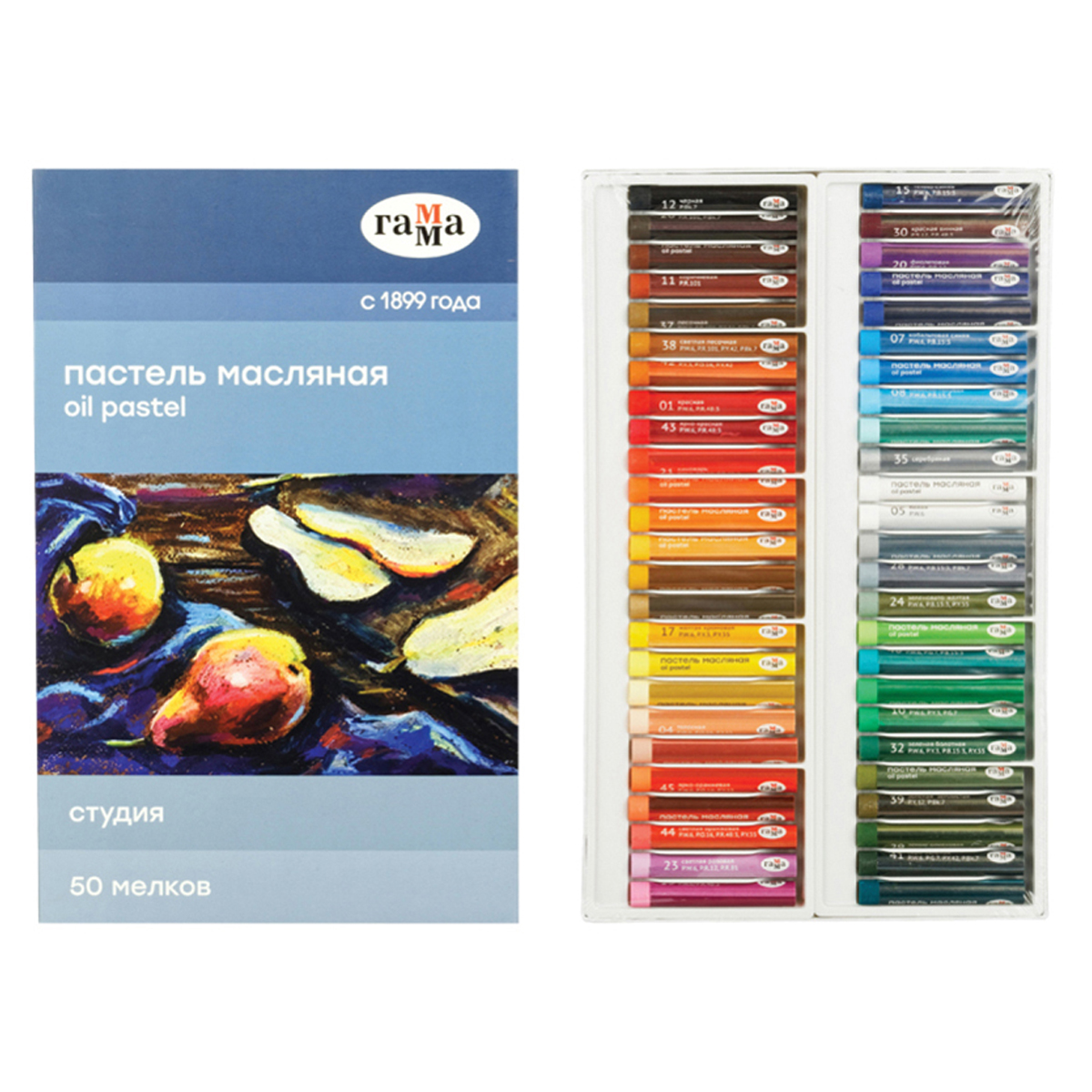 "Масляная пастель «Студия» изготовлена на основе тонкотертых пигментов и минерального масла. В составе набора 48 цветных и 2 белых мелка. Оставляет мягкий штрих, легко растушевывается. Яркие насыщенные цвета легко смешиваются, не светлеют и не темнеют со временем. Масляная пастель рисует на поверхностях разных фактур, не осыпается и не требует использования закрепителя краски.