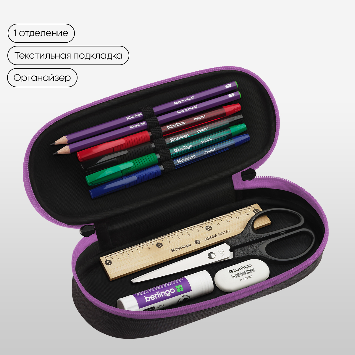 Пенал-футляр школьный корпусный Berlingo имеет одно отделение. Материал лицевой поверхности и подкладки – полиэстер. На верхней откидной крышке расположены крепления-резиночки для канцелярских принадлежностей. Застежка – молния. Поставляется без наполнения. Индивидуальная упаковка - пакет.