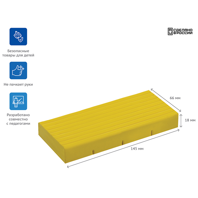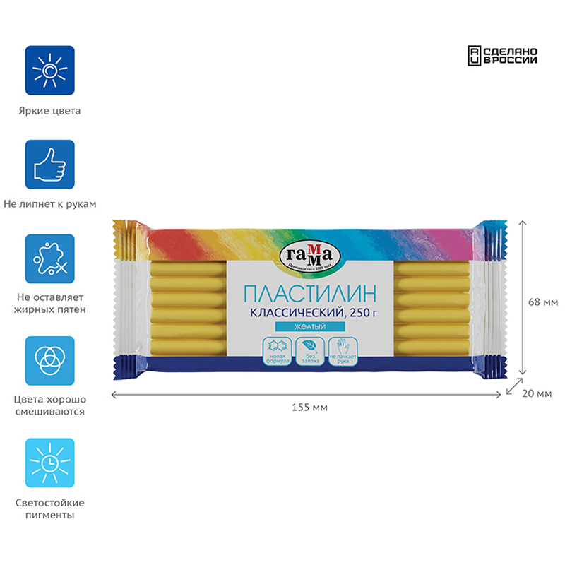 Пластилин серии "Классическая" собрал в себе все уникальные характеристики и свойства благодаря новой улучшенной формуле. Разработан для детей от 9 до 15 лет. Пластилин становится мягким при разминании, очень податливый в работе, позволяет лепить тончайшие элементы, не липнет к рукам и не окрашивает их, хорошо держит форму поделки, не крошится при отрыве, обладает яркими, чистыми цветами, которые прекрасно смешиваются друг с другом. Пластилин серии "Классическая" прекрасно подходит для создания картин.