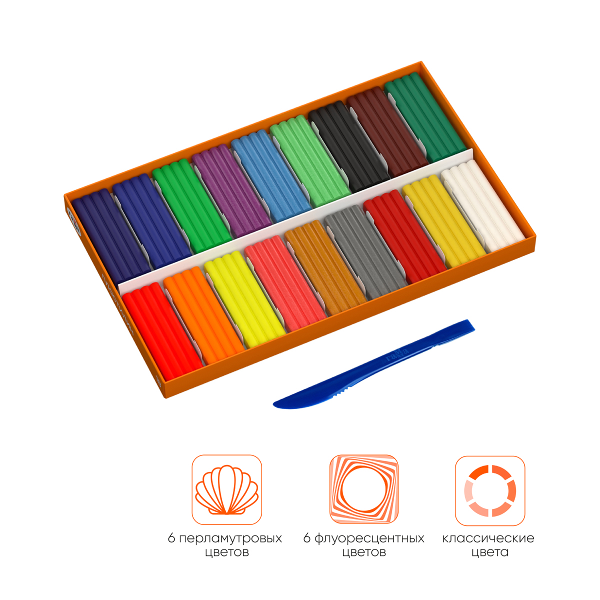 Уникальная серия пластилина "Оранжевое Солнце" представляет собой сочетание классических цветов и цветов с различными эффектами. В данном наборе пластилина представлены 6 классических, 6 флуоресцентных и 6 цветов с перламутровым эффектом. Создавайте яркие и очень выразительные поделки и картины, используя все оттенки пластилина. Материал отлично держит форму и не крошится, у него приятная текструра и высокая пластичность. Пластилин не липнет к рукам и рабочей поверхности. Без выраженного химического запаха.