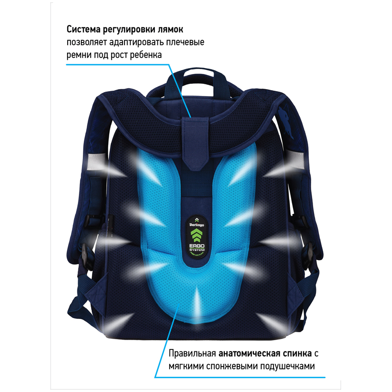 Благодаря анатомической вентилируемой спинке, регулируемым по длине и высоте лямкам, а также нагрудному креплению ранец плотно фиксируется на спине ребенка, что помогает равномерно распределить нагрузку и сохранить правильную осанку. Уплотненная мягкая ручка и петля для подвешивания к парте делают ранец очень удобным. Дно выполнено из водонепроницаемого материала с пластиковыми ножками для защиты от влаги. Световозвращающие элементы на лямках, передней и боковых частях ранца обеспечивают безопасность ребенка в темное время суток. Подвеска в подарок. Вес ранца менее 1 кг.