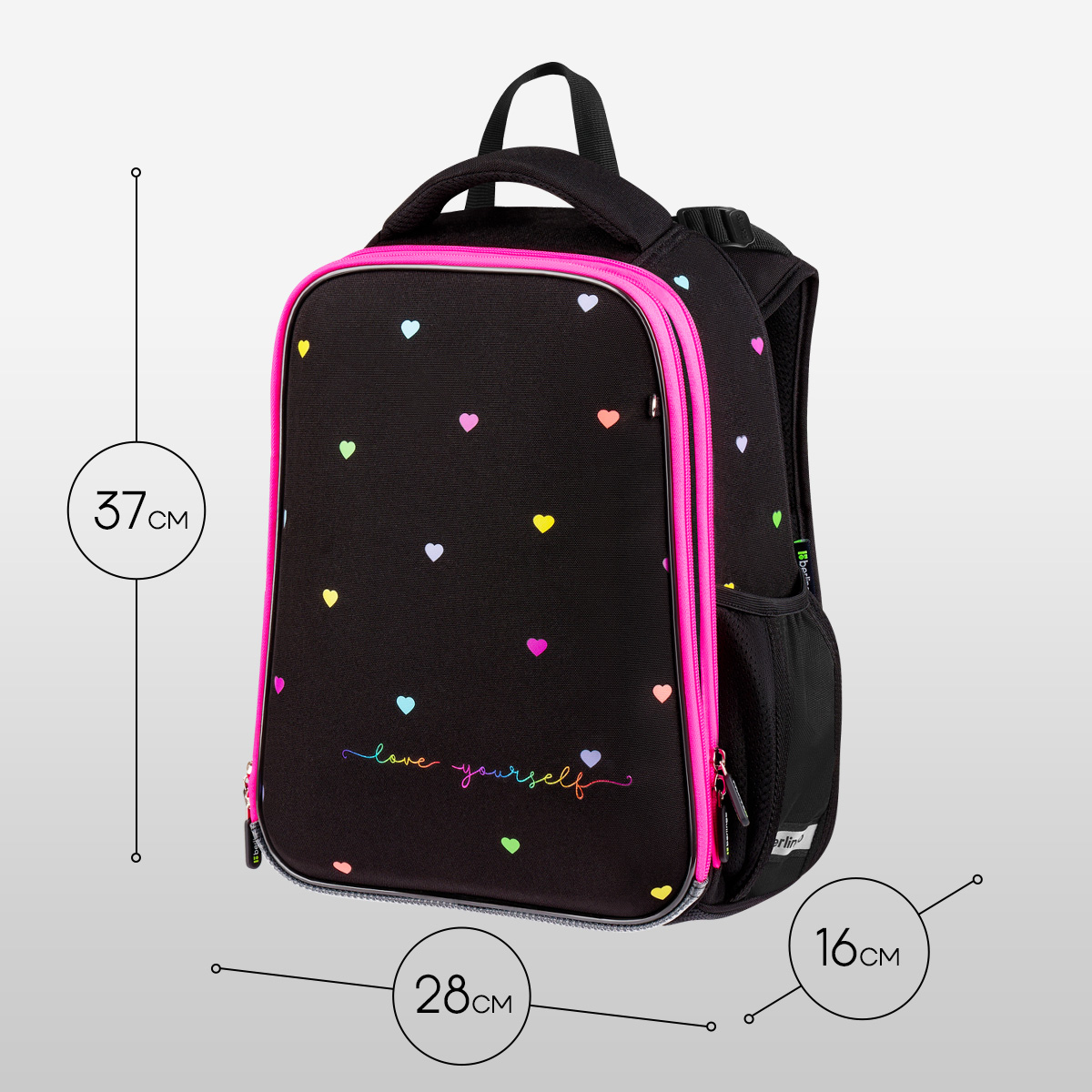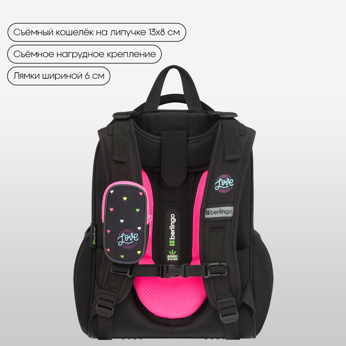 Ранец имеет 2 отделения, 2 боковых кармана на резинке, съемный кошелек на лямке для быстрого доступа к необходимым вещам. Внутри предусмотрены разделители для учебных пособий, органайзер для письменных принадлежностей, карман для мобильного телефона, съемный карабин для ключей и именная карточка для подписи.