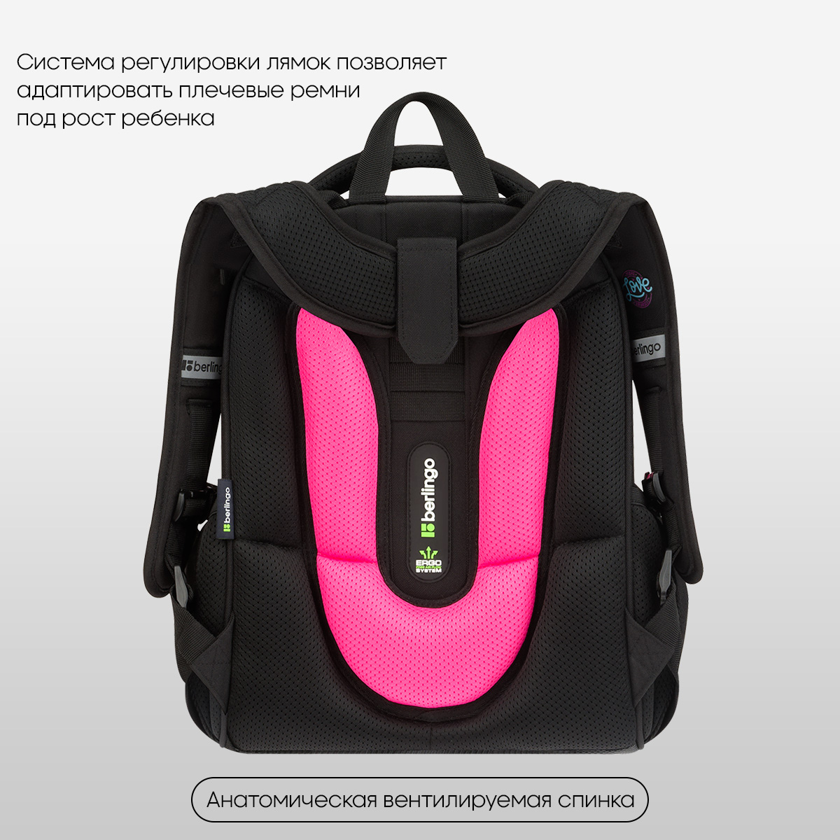 Благодаря анатомической вентилируемой спинке, регулируемым по длине и высоте лямкам, а также нагрудному креплению ранец плотно фиксируется на спине ребенка, что помогает равномерно распределить нагрузку и сохранить правильную осанку. Уплотненная мягкая ручка и петля для подвешивания к парте делают ранец очень удобным. Дно выполнено из водонепроницаемого материала с пластиковыми ножками для защиты от влаги. Световозвращающие элементы на лямках, передней и боковых частях ранца обеспечивают безопасность ребенка в темное время суток. Вес ранца 950 г.