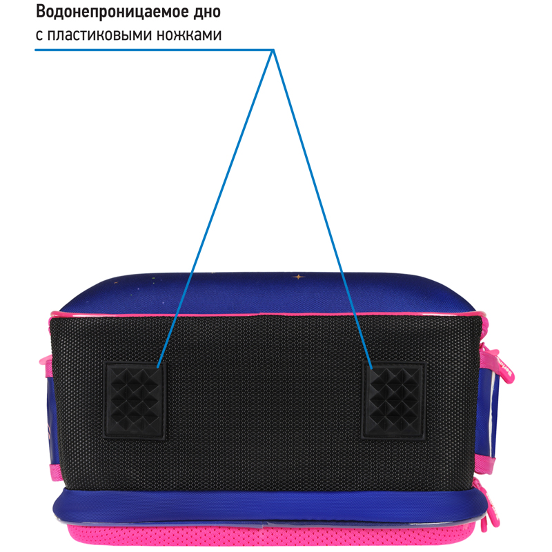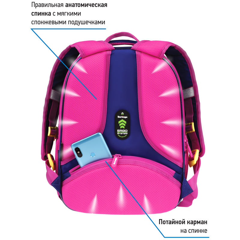 Благодаря анатомической вентилируемой спинке, регулируемым по длине лямкам, а также нагрудному креплению ранец плотно фиксируется на спине ребенка, что помогает равномерно распределить нагрузку и сохранить правильную осанку. Уплотненная мягкая ручка и петля для подвешивания к парте делают ранец очень удобным. Дно выполнено из водонепроницаемого материала с пластиковыми ножками для защиты от влаги. Световозвращающие элементы на лямках, передней и боковых частях ранца обеспечивают безопасность ребенка в темное время суток. Мешок для обуви в комплекте, предусмотрено крепление мешка к ранцу с помощью специальных фиксаторов. Вес 950 г.