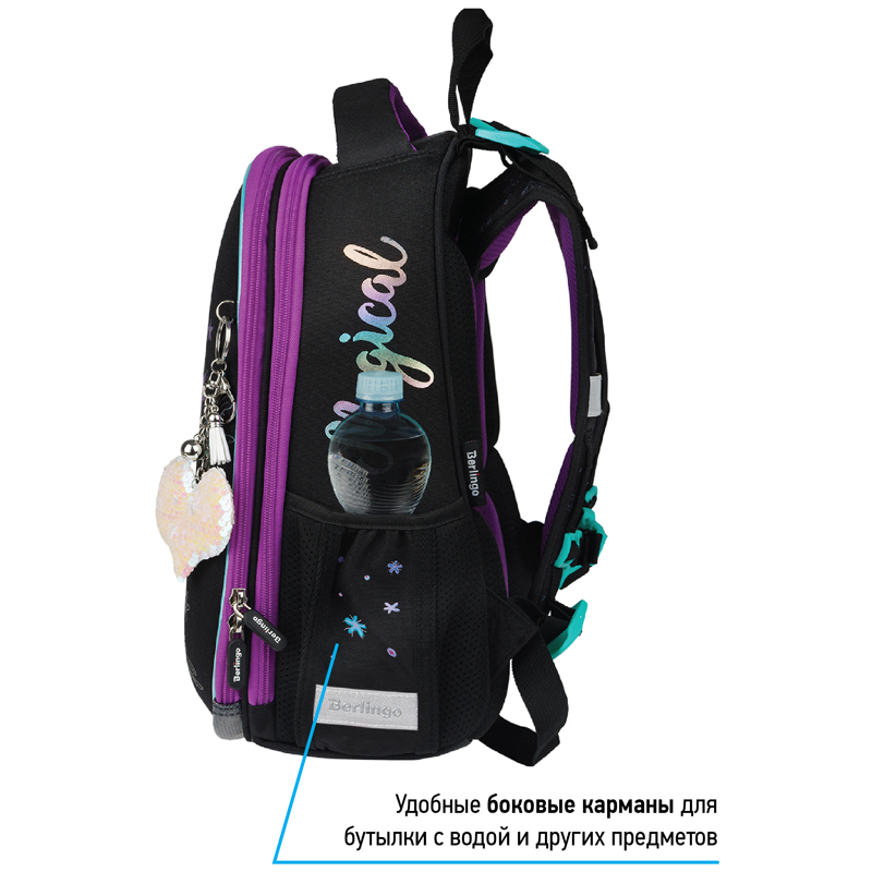 Ранец для школы имеет 2 отделения, 2 боковых кармана на резинке, съемный кошелек на лямке для быстрого доступа к необходимым вещам. Внутри предусмотрены разделители для учебных пособий, органайзер для письменных принадлежностей, карман для мобильного телефона, карабин для ключей и именная карточка для подписи. Уплотненная мягкая ручка и петля для подвешивания к парте делают ранец очень удобным. Дно выполнено из водонепроницаемого материала с пластиковыми ножками для защиты от влаги. Световозвращающие элементы на лямках, передней и боковых частях ранца обеспечивают безопасность ребенка в темное время суток. Подвеска в подарок.