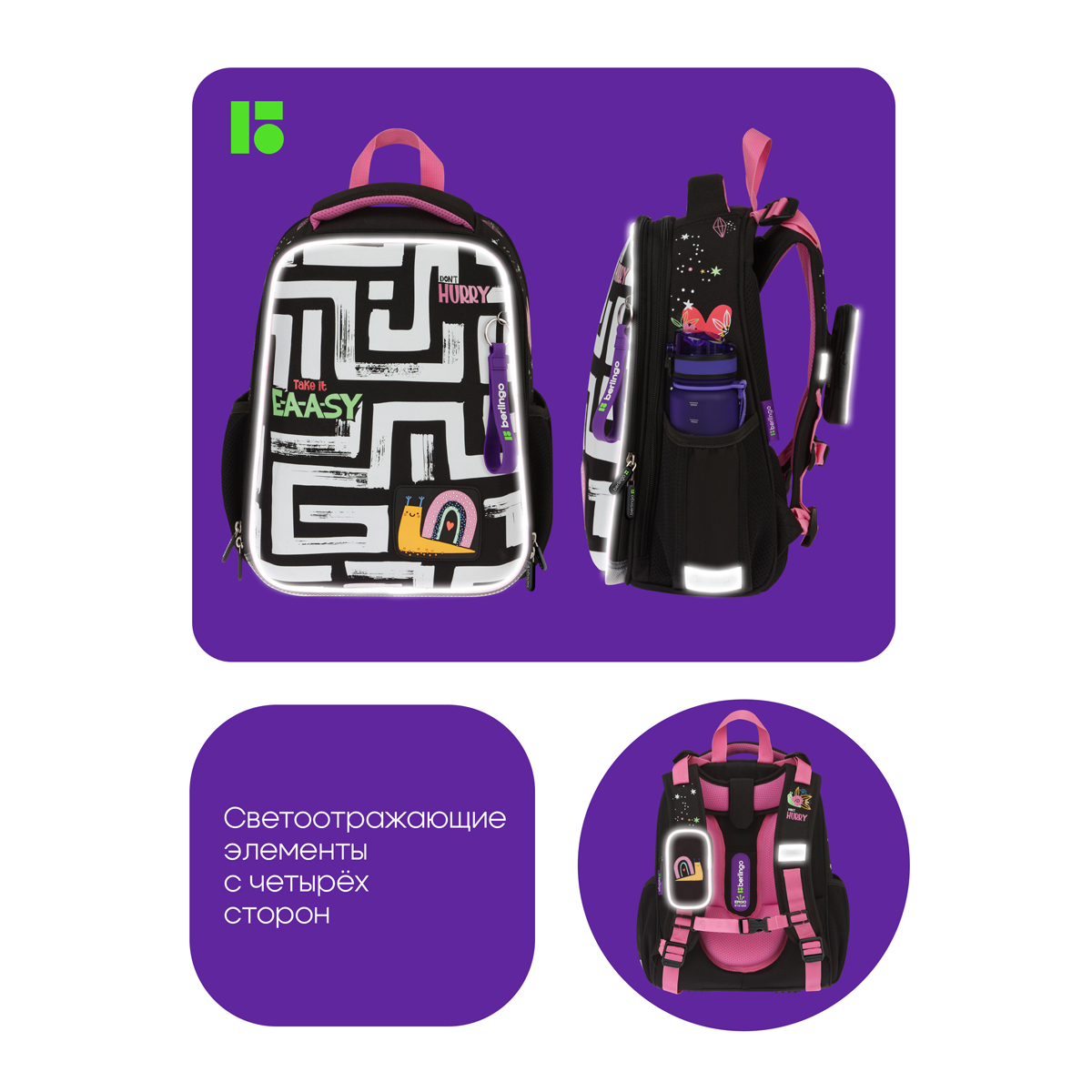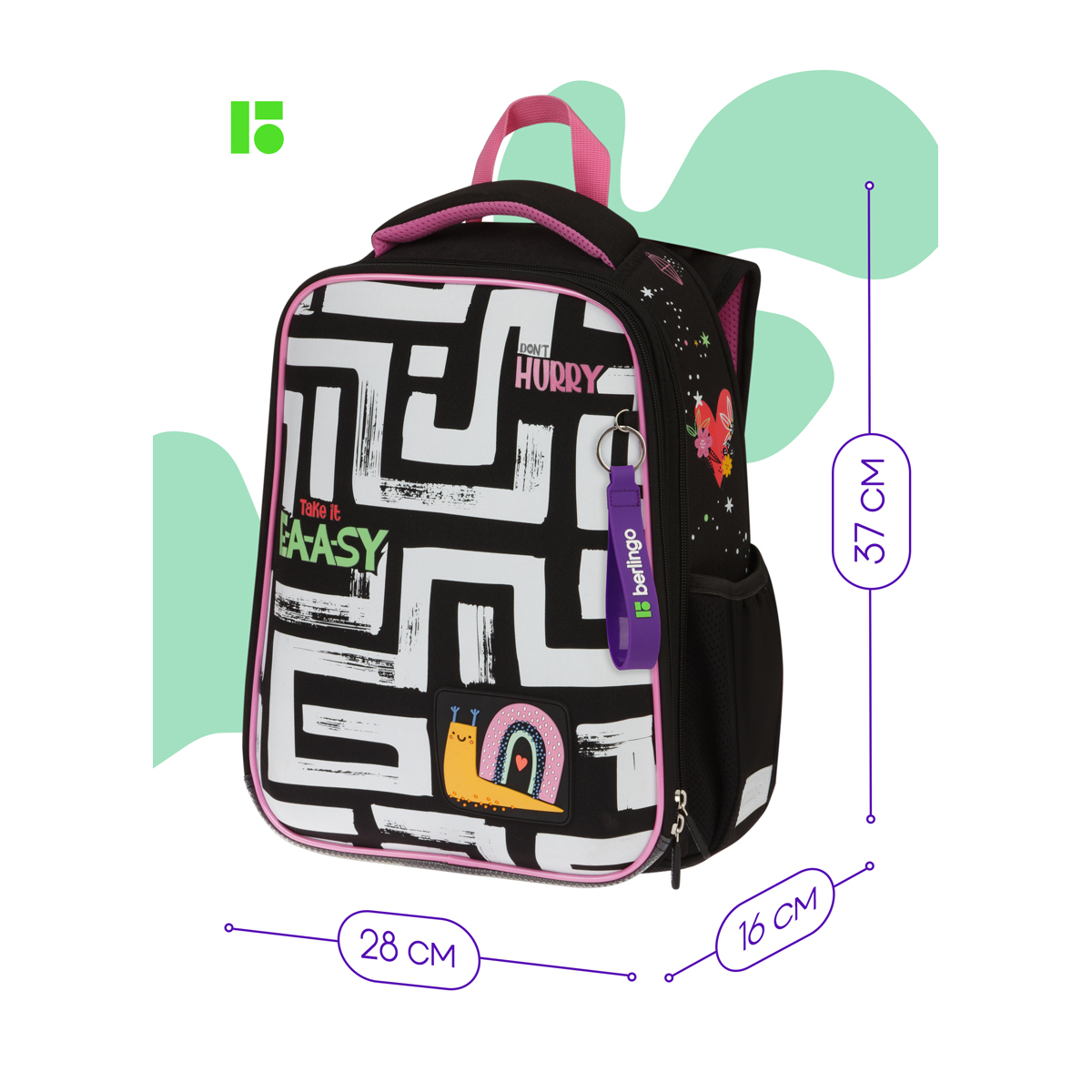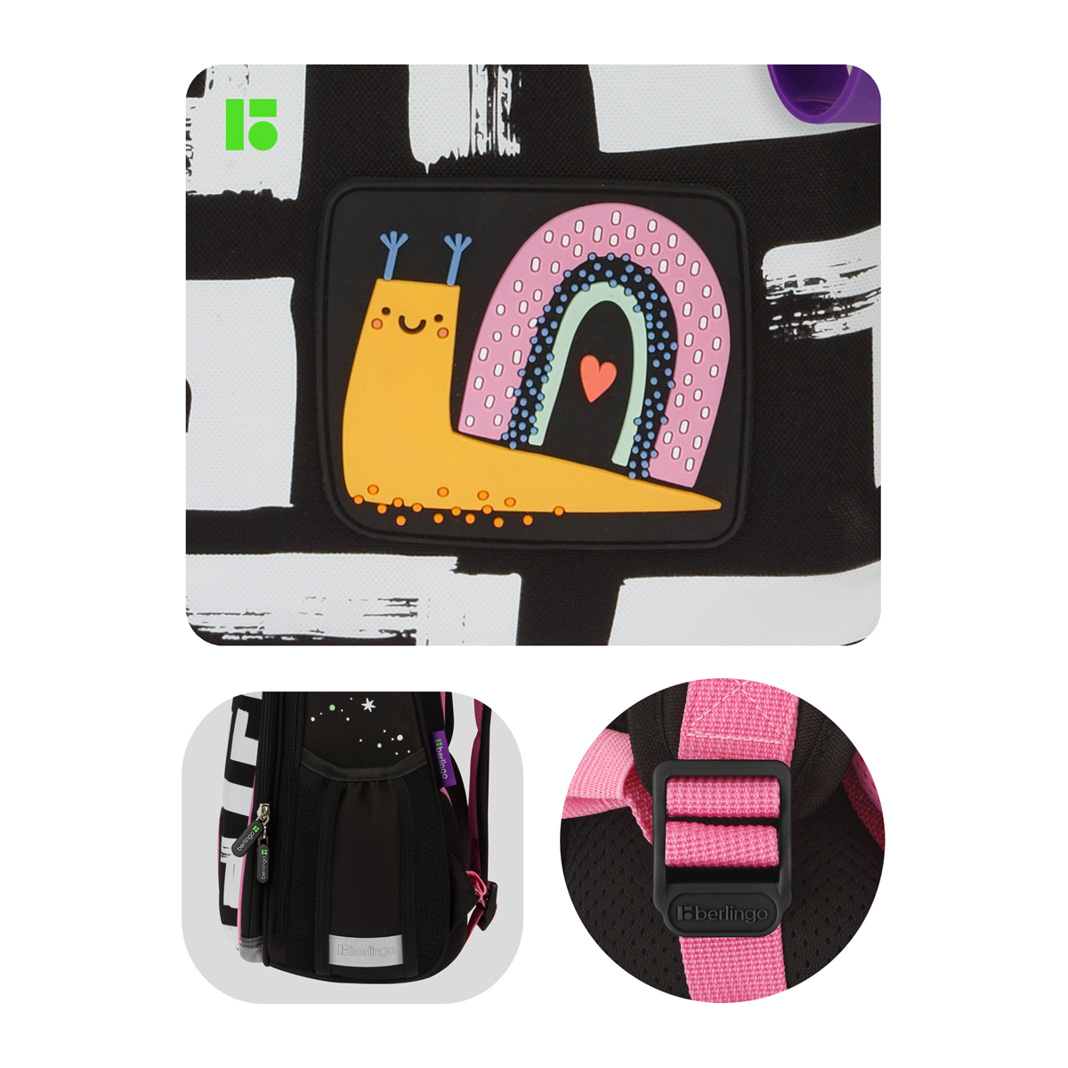 Ранец Berlingo Expert Snail размером 37*28*16 см и объемом 16,5 литра имеет 2 отделения, 2 боковых кармана, съемный кошелек на лямке для быстрого доступа к необходимым вещам. Внутри — разделители для тетрадей и учебников, органайзер, карман для смартфона, съемный карабин для ключей и именная карточка для подписи. Снаружи — экологичный ЭВА-материал с покрытием из прочной нейлоновой ткани, уплотненная мягкая ручка и петля для подвешивания к парте, дно из водонепроницаемого материала с пластиковыми ножками, световозвращающие элементы на лямках, передней и боковых частях ранца — для безопасности ребенка в темное время суток. Не боится влаги.