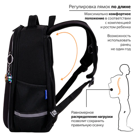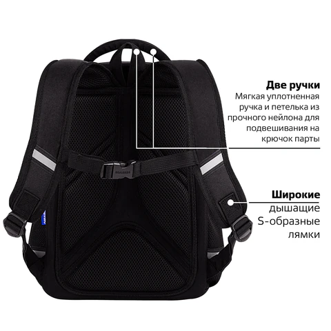 Удобная мягкая вентилируемая спинка с воздушными спонжевыми панелями разработана с учетом анатомических особенностей детей младшего школьного возраста. При правильной регулировке ранец будет практически не ощущаться на плечах и не будет доставлять дискомфорт при носке. В процессе эксплуатации равномерное распределение нагрузки позволит сохранить правильную осанку!